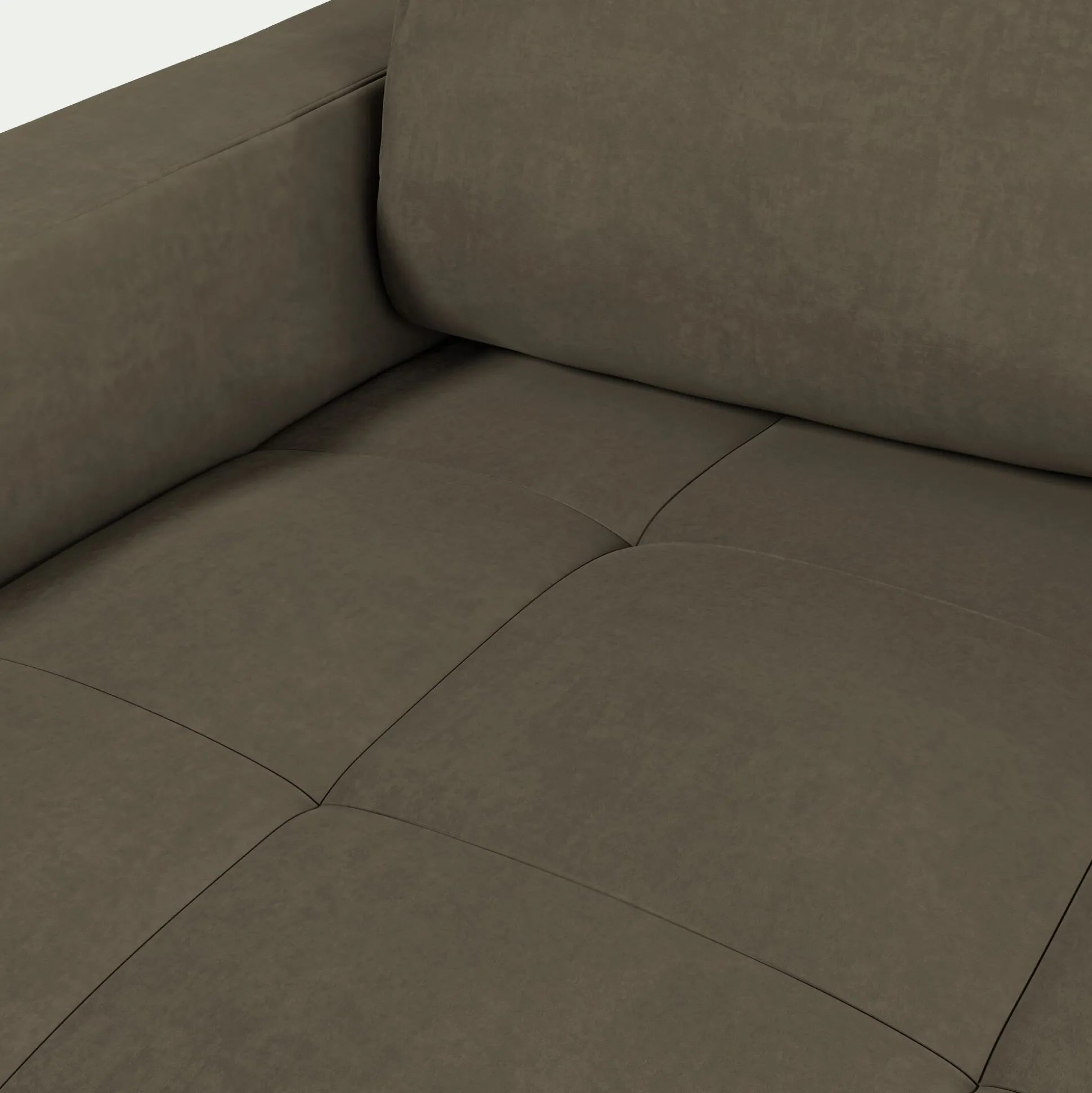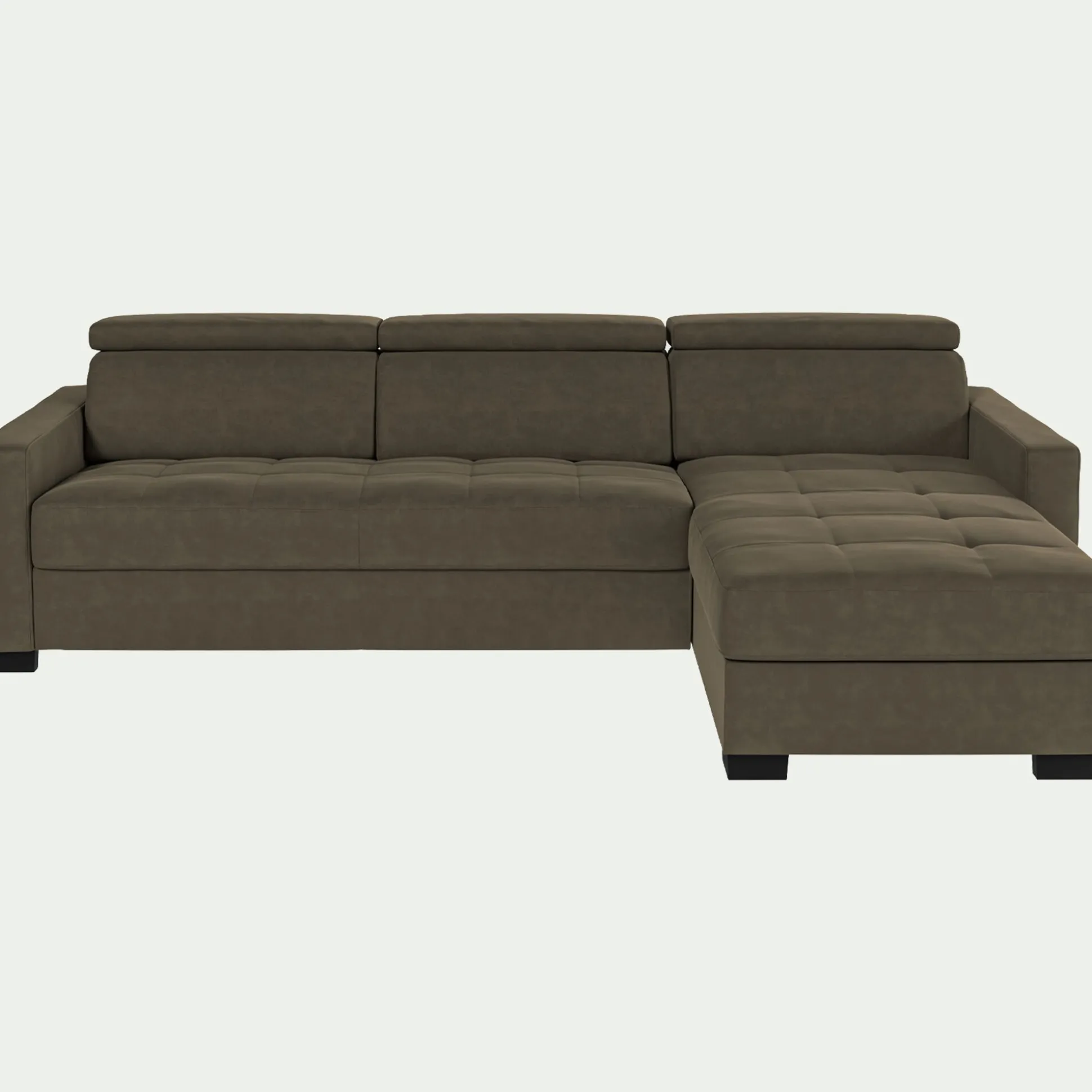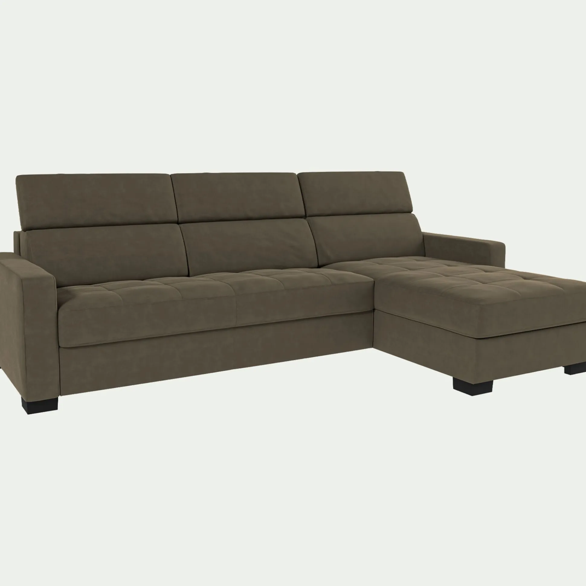 Mauro est une gamme de canapés au style contemporain et d’une grande élégance pour décorer votre salon. Conçu en Italie, il est le fruit d’un travail minutieux et d’un savoir-faire unique. Ce canapé d’angle en velours couleur Taupe, arborant de larges accoudoirs de 15 cm et des têtières relevables, vous procure un confort d’assise incomparable et vous invite à savourer d’agréables moments de détente. Avec sa fonction convertible, vous pourrez le transformer en un confortable couchage afin d’accueillir famille et amis. Un meuble de fabrication européenne qui sera la pièce maîtresse de votre salon et sublimera votre décoration d’intérieur.