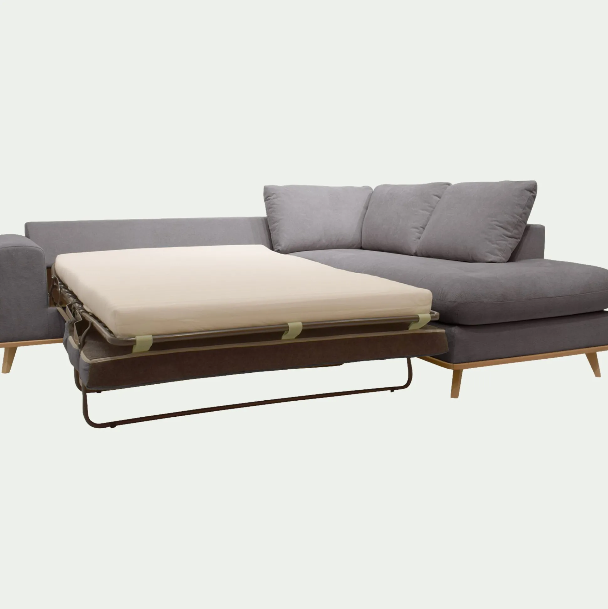 Le canapé d’angle convertible Capia allie confort, style et praticité. De jour, il offre une assise spacieuse pour 5 personnes grâce à son angle à droite. Ce canapé est alors revêtu d’un tissu Crown dans notre coloris gris restanque, moderne et apaisant. Son tissage certifié Oeko-Tex apporte douceur et résistance, parfait pour une utilisation quotidienne. Le soir, il se transforme en un couchage d’appoint de 120×190 cm grâce à un mécanisme d’ouverture rapide et facile, intégrant un sommier et un matelas pour un confort optimal. Son design repose sur une structure en pin massif et des pieds en hêtre massif, gage de solidité et de durabilité. Les coussins de dos déhoussables facilitent l’entretien. Une fabrication française qui conjugue esthétique et fonctionnalité.