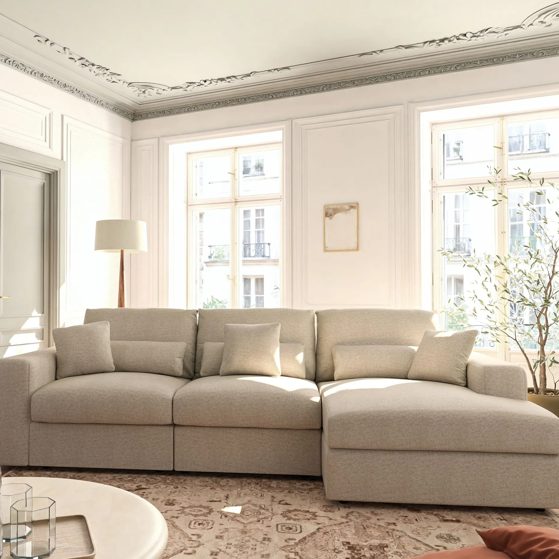 Le canapé Piuma est idéal pour se prélasser dans votre salon. Avec ses grandes assises, ce canapé d’angle droit en tissu chenille vous offre un confort exceptionnel. Il vous permet de vous détendre au coeur de coussins moelleux dans un nuage de douceur renforcé par son tissu délicat. Vous pourrez ainsi recevoir famille et amis lors d’un moment apaisant. Ce canapé fixe de couleur beige roucas apporte également une touche design moderne et élégante à votre salon. Son tissu chenille donne un côté cocooning qui vous permet de transformer votre pièce en un espace chaleureux.