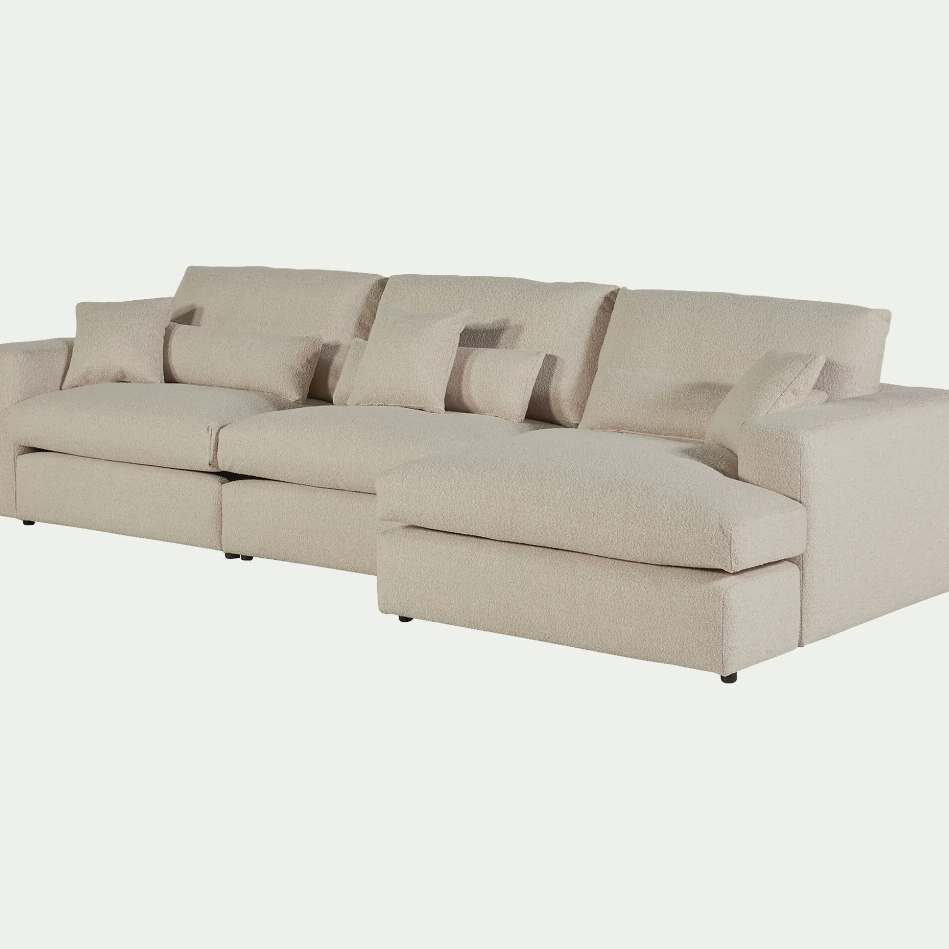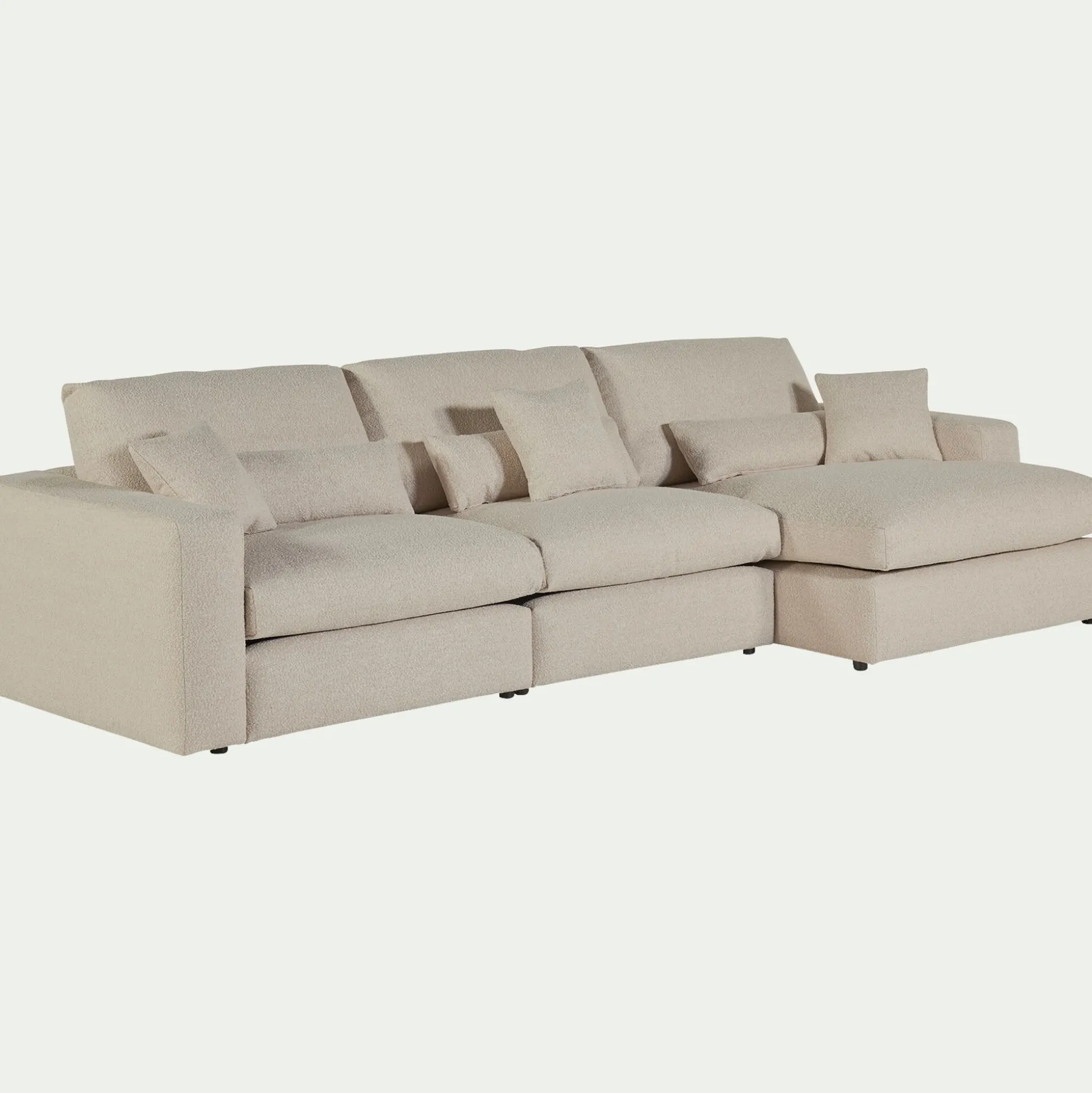 Le canapé Piuma est idéal pour se prélasser dans votre salon. Avec ses grandes assises, ce canapé d’angle droit en tissu bouclette vous offre un confort exceptionnel. Il vous permet de vous détendre au coeur de coussins moelleux dans un nuage de douceur renforcé par son tissu délicat. Vous pourrez ainsi recevoir famille et amis lors d’un moment apaisant. Ce canapé fixe de couleur blanche apporte également une touche design moderne et élégante à votre salon. Son tissu bouclette donne un côté cocooning qui vous permet de transformer votre pièce en un espace chaleureux.