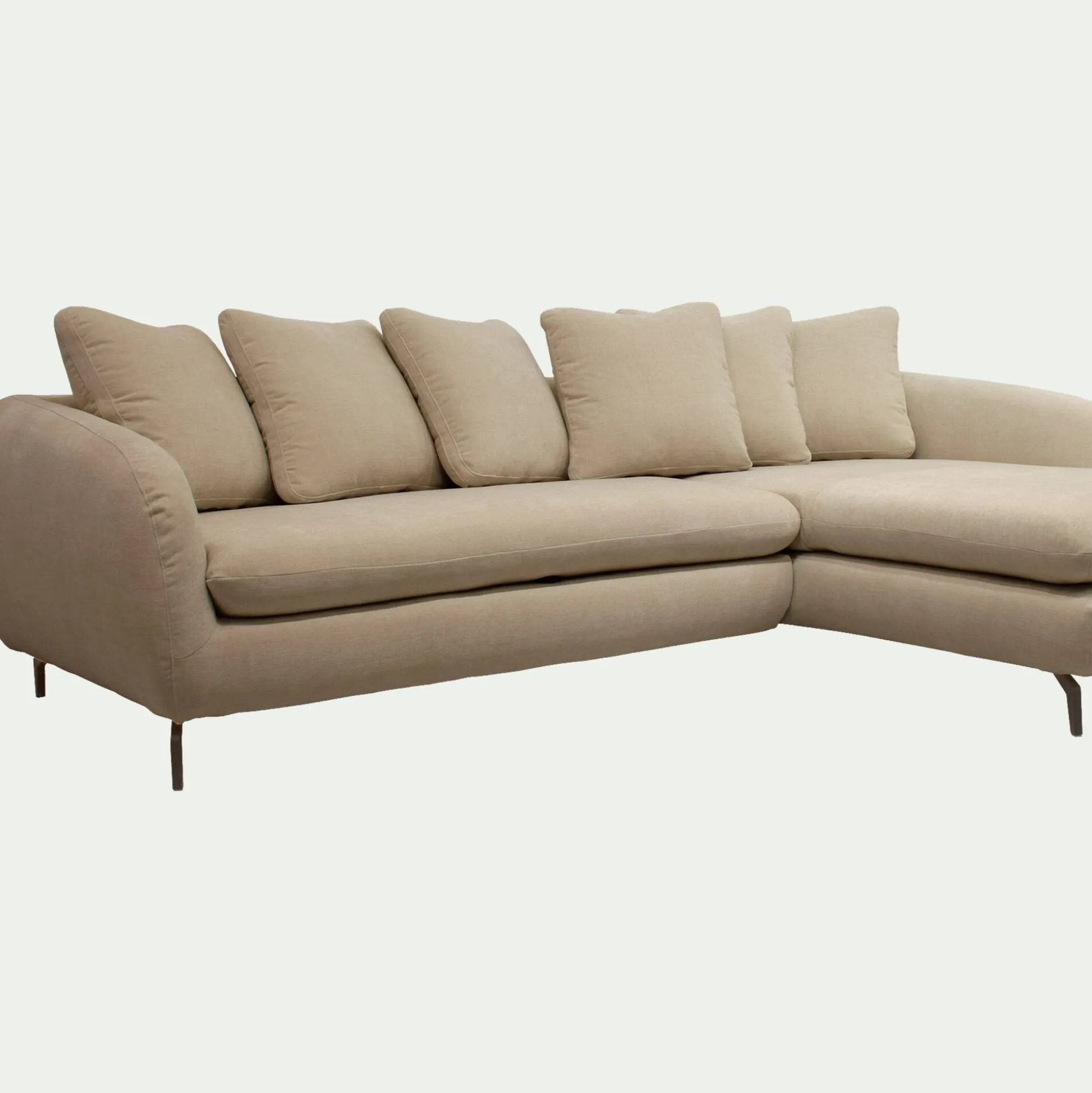 Un joli canapé d’angle droit en tissu pour profiter agréablement de votre salon. Un look contemporain et accueillant, sublimé par un piétement original en acier noir. Vous apprécierez la forme du dossier et des accoudoirs qui vous offrent un maintien optimal de votre dos pour un confort d’assise exceptionnel. Un canapé fabriqué en France, dans des ateliers proches de la ville de Bourge, qui incarne l’excellence du savoir-faire français. Un coloris beige qui apporte une note citadine et raffinée à votre décoration de salon.