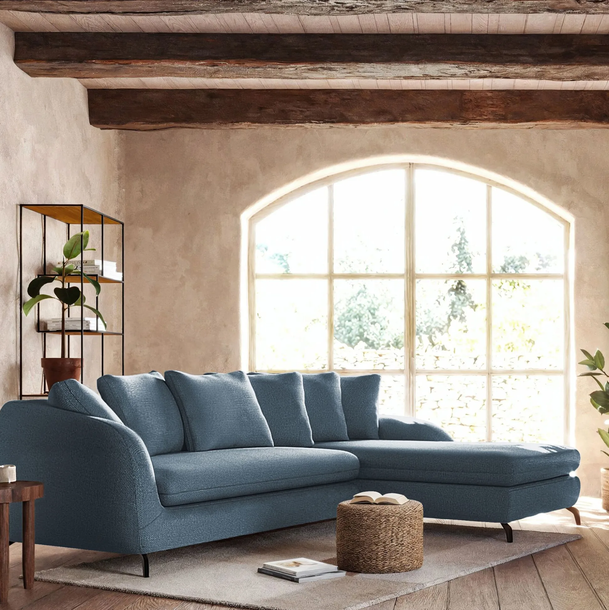 Un joli canapé d’angle droit en tissu pour profiter agréablement de votre salon. Un look contemporain et accueillant, sublimé par un piétement original en acier noir. Vous apprécierez la forme du dossier et des accoudoirs qui vous offrent un maintien optimal de votre dos pour un confort d’assise exceptionnel. Un canapé fabriqué en France, dans des ateliers proches de la ville de Bourge, qui incarne l’excellence du savoir-faire français. Un coloris bleu qui apporte une note citadine et raffinée à votre décoration de salon.