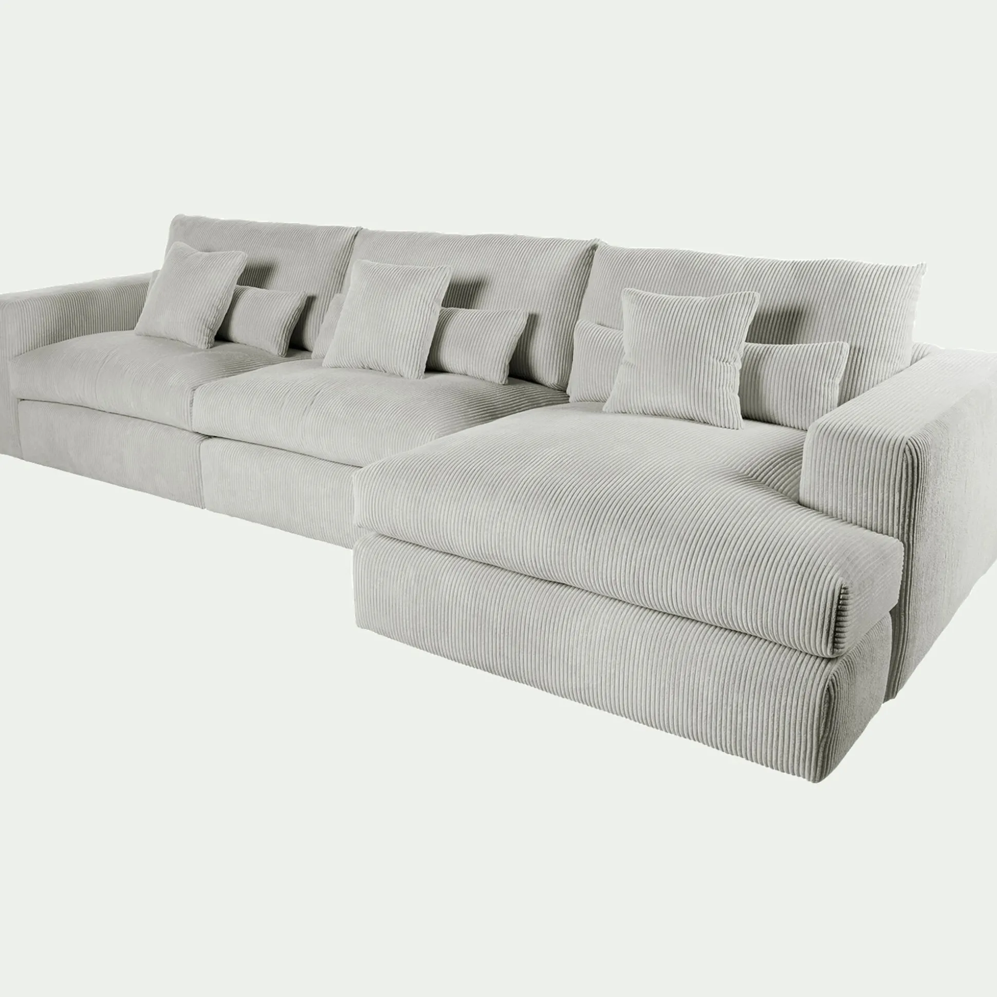 Le canapé Piuma est idéal pour se prélasser dans votre salon. Avec ses grandes assises, ce canapé d’angle droit en velours côtelé vous offre un confort exceptionnel. Il vous permet de vous détendre au coeur de coussins moelleux dans un nuage de douceur renforcé par son tissu délicat. Vous pourrez ainsi recevoir famille et amis lors d’un moment apaisant. Ce canapé fixe de couleur gris apporte également une touche design moderne et élégante à votre salon. Son velours côtelé donne un côté cocooning qui vous permet de transformer votre pièce en un espace chaleureux.