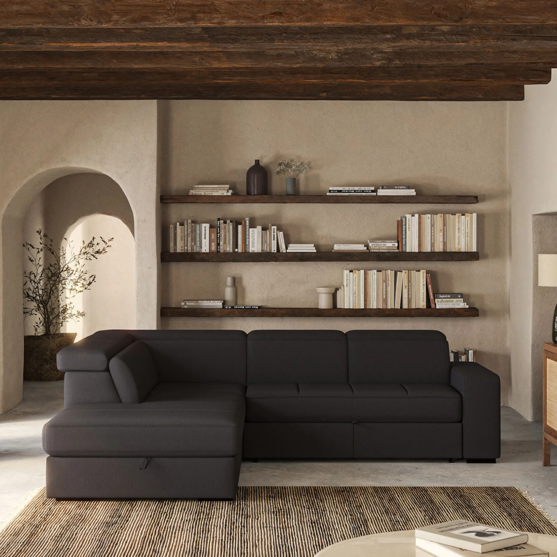Un superbe canapé d’angle gauche en tissu d’une couleur gris ardoise, idéal pour un grand salon. Ce canapé vous offre un espace détente spacieux et confortable avec son assise capitonnée et ses têtières relevables qui accompagneront tous vos mouvements. Convertible, il met à votre disposition un couchage d’appoint de 130×200 cm avec un matelas de 10 cm d’épaisseur qui se déploie aisément. Pratique et astucieux grâce à son coffre, ce grand canapé allie fonctionnalité, style et confort.