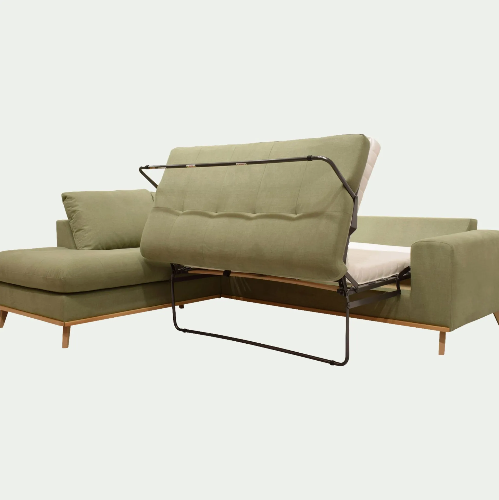 Le canapé d’angle convertible Capia allie confort, style et praticité. De jour, il offre une assise spacieuse pour 5 personnes grâce à son angle à gauche. Ce canapé est alors revêtu d’un tissu Cosmo dans notre coloris vert kaki, délicate et chaleureuse. Son tissage résistant apporte douceur et durabilité, parfait pour une utilisation quotidienne. Le soir, il se transforme en un couchage d’appoint de 120×190 cm grâce à un mécanisme d’ouverture rapide et facile, intégrant un sommier et un matelas pour un confort optimal. Son design repose sur une structure en pin massif et des pieds en hêtre massif, gage de solidité et de durabilité. Les coussins de dos déhoussables facilitent l’entretien. Une fabrication française qui conjugue esthétique et fonctionnalité.