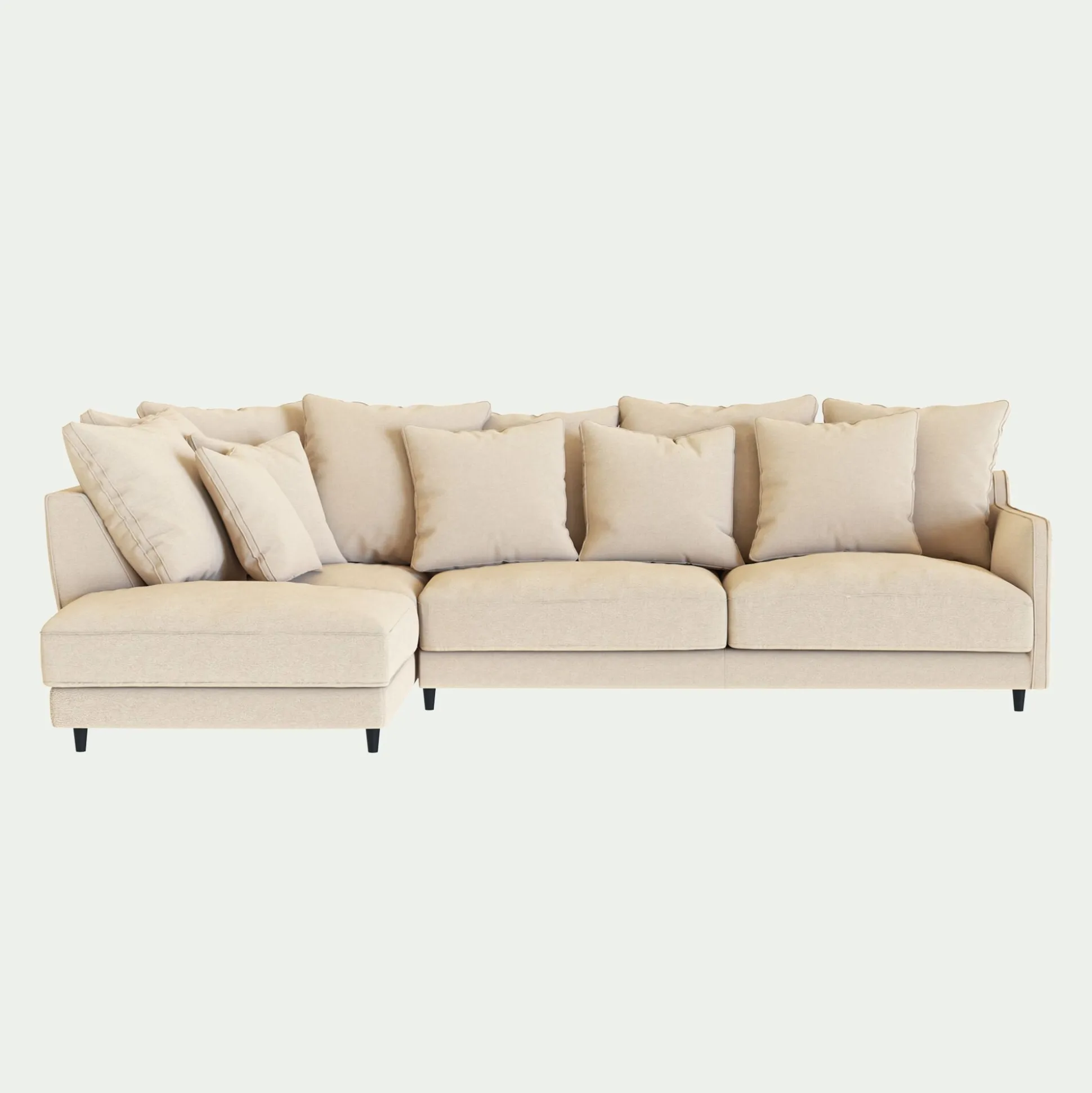Assise et dossier : mousse polyuréthane densité de 30 kg/m3 et couette en fibre polyester. 7 coussins dossier 60×60: Plumes d’oie et fibre polyester. 4 coussins 50×50: Plumes d’oie et fibre polyester.