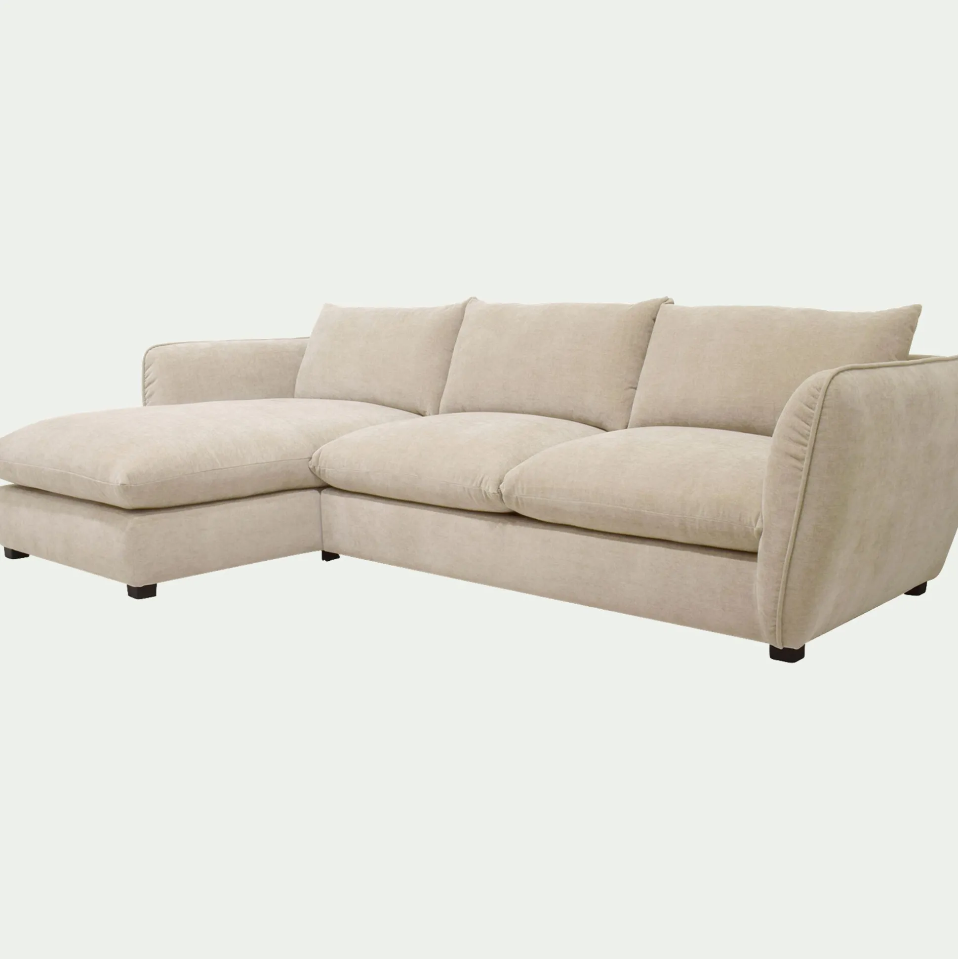 Élégant et généreux, ce canapé d’angle fixe invite à la détente avec son assise profonde et ultra-confortable. Son revêtement en tissu blanc écru sublime son design cossu, idéal pour aménager un intérieur raffiné et lumineux. Pensé pour accueillir jusqu’à cinq personnes, il combine confort et style grâce à ses coussins moelleux et entièrement déhoussables, facilitant l’entretien. Fabriqué en France, ce canapé en tissu repose sur une structure en bois massif garantissant robustesse et durabilité. Son angle à gauche optimise l’espace et crée un coin où se détendre en toute sérénité. Parfait équilibre entre modernité et confort enveloppant, ce canapé deviendra sans aucun doute la pièce maîtresse du salon.