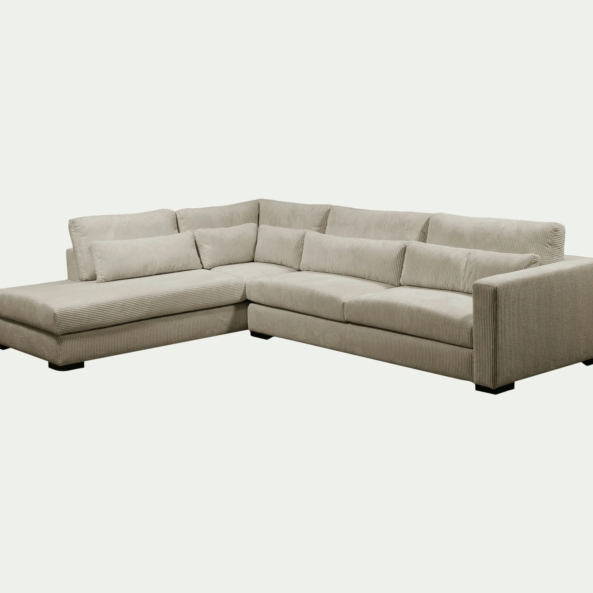 Ce canapé d’angle avec méridienne à gauche transforme le salon en un véritable espace bien-être. Son grand format accueille toute la famille ou permet de s’allonger entièrement pour une détente absolue. Revêtu d’un velours côtelé dans un coloris taupe à la fois naturel et intemporel, il séduit par son toucher doux et soyeux, reflétant la lumière pour une touche de brillance. Son assise profonde repose sur une structure en bois massif et des ressorts qui garantissent un maintien souple et durable. Pratique, ses coussins de dossier et d’assise sont déhoussables pour un entretien facilité. Généreux et élégant, ce grand canapé fixe insuffle du caractère à la pièce et s’impose comme un allié incontournable des instants de détente et de convivialité.