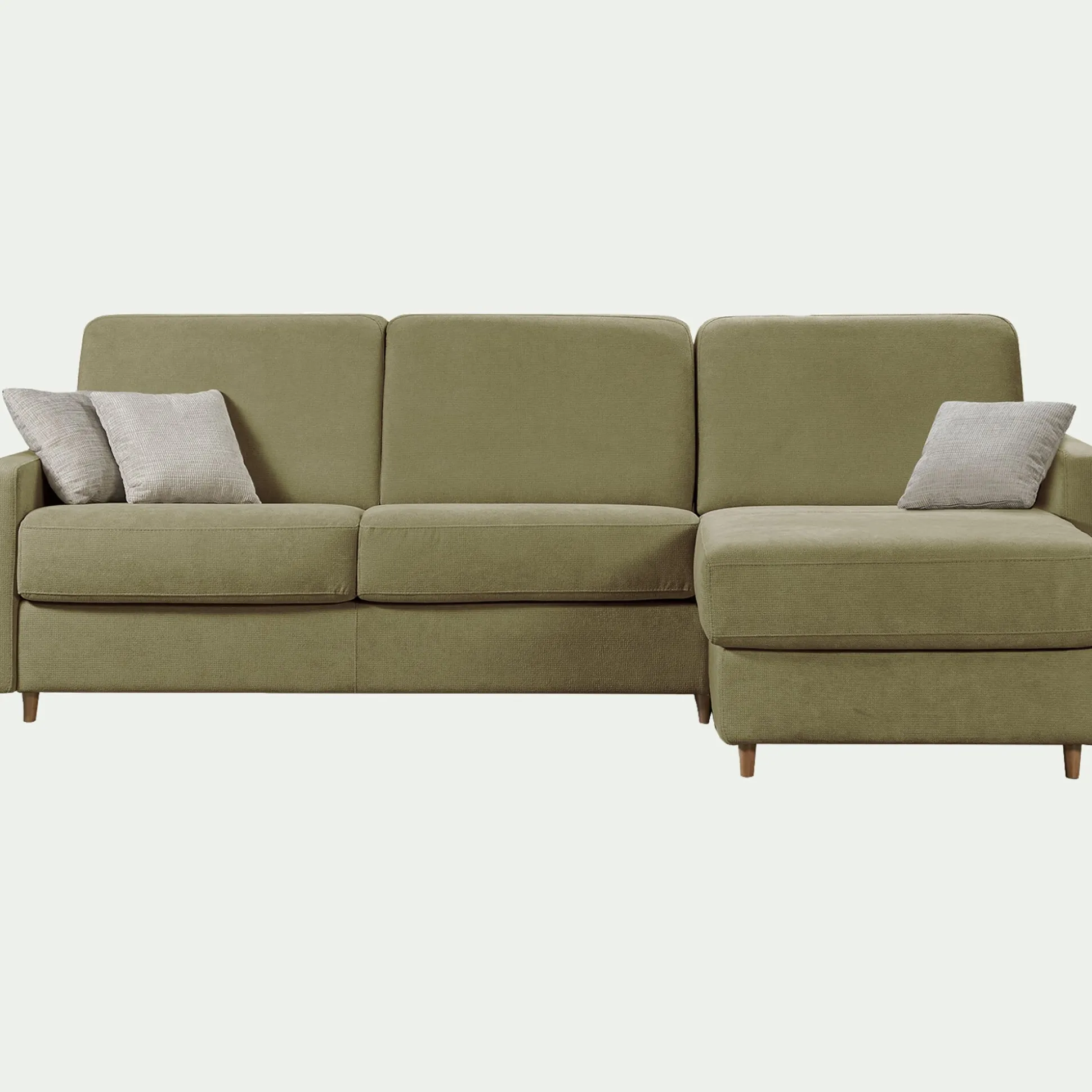 Le canapé Gaya conjugue avec brio élégance italienne et fonctionnalité. Réalisé avec un savoir-faire d’exception, ce canapé d’angle convertible associe design et confort pour s’intégrer harmonieusement dans le salon. Son système ingénieux dévoile en quelques secondes un couchage quotidien de 140×195 cm, doté d’une densité de 25kg/m³ qui assure un soutien optimal et des nuits agréables. Le mécanisme express permet l’ouverture sans retirer les coussins, pour un usage simple et fluide. Revêtu du tissu Stella dans notre coloris vert cèdre, il apporte une note naturelle et raffinée tout en garantissant une assise confortable et un maintien adapté à chaque partie du corps. Pratique, il intègre un coffre de rangement dans la méridienne et son angle est réversible pour s’adapter à toutes les configurations. Les coussins d’assise et de dossier sont déhoussables, parfaits pour un entretien facile.