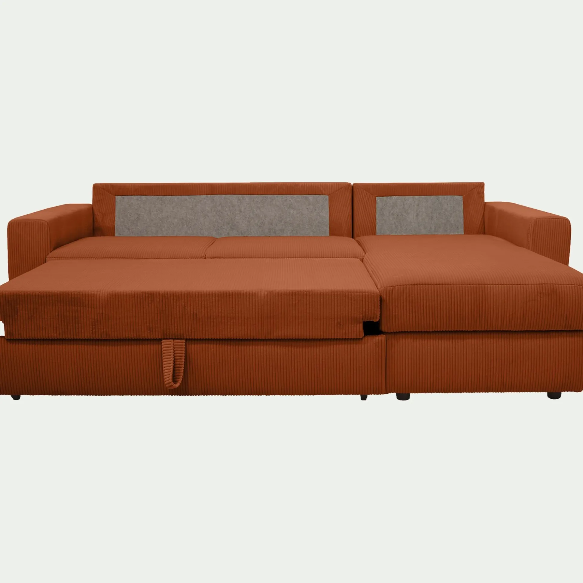 Un élégant canapé d’angle en velours côtelé 4 places pour votre salon. Son coloris brun rustrel apporte une touche de nature méditerranéenne tendance à votre décoration. Un canapé confortable doté d’épais coussins pour une assise d’une grande qualité. Ce canapé s’ouvre facilement et vous permet d’obtenir un lit pour vos convives. Un couchage occasionnel de grande taille, particulièrement utile. Sa méridienne peut être fixée aussi bien à droite qu’à gauche, afin que vous puissiez choisir l’angle. Elle vous offre également un grand coffre de rangement, idéal pour disposer un plaid, des couvertures et des oreillers. Entièrement conçu en France, ce canapé incarne le savoir faire et le charme à la française. Un canapé déco pour se détendre et passer d’agréables moments entre amis ou en famille.