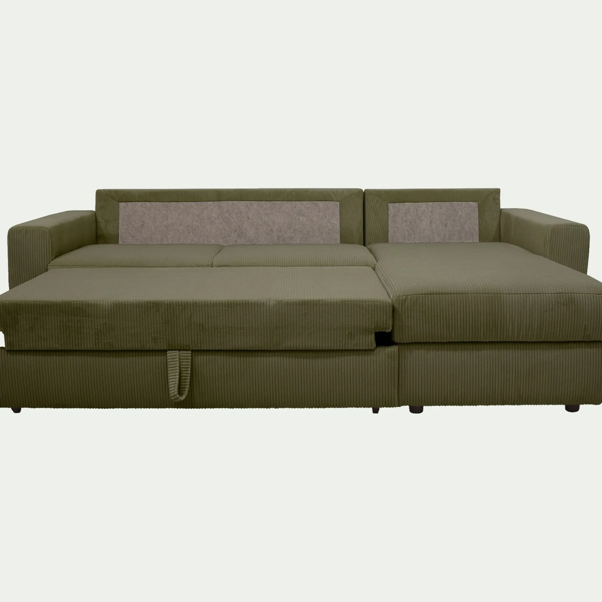 Le canapé Honoré cumule confort, praticité et élégance pour devenir la pièce maîtresse du salon. Son généreux format 4 places en velours côtelé vert cèdre invite à la détente, avec un dossier moelleux et une assise accueillante. Sa méridienne réversible, positionnable à droite comme à gauche, permet d’adapter facilement l’agencement selon l’espace disponible. Elle dissimule par ailleurs un coffre de rangement astucieux, idéal pour optimiser l’organisation du salon. Convertible, ce canapé se transforme en un couchage d’appoint de 140×200 cm, parfait pour recevoir en toute sérénité. Chaleureux et fonctionnel, il combine allure contemporaine et confort absolu, pour des instants de partage comme de repos.