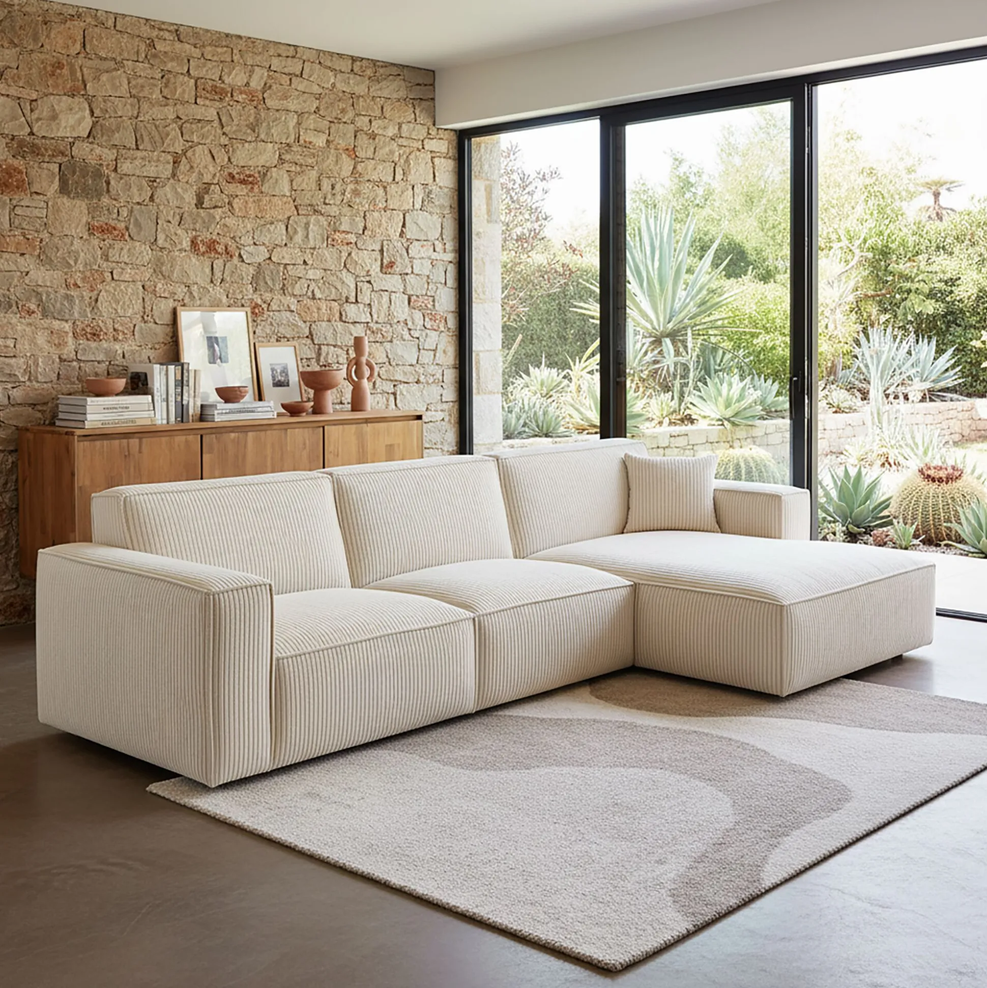 Le canapé d’angle droit Kubo transformera votre intérieur tout en vous offrant un confort absolu pour vos moments de détente grâce à sa grande méridienne. Ses lignes rectangulaires confèrent une touche de modernité à votre salon, ajoutant une note contemporaine à votre décoration. Conçu en Ukraine, ce canapé fixe allie qualité et savoir-faire. Son assise généreuse et moelleuse vous permettra d’accueillir famille et amis pour des moments de partage conviviaux. Revêtu d’un velours côtelé dans notre coloris beige, il adoucit votre pièce pour une ambiance chic et actuelle.
