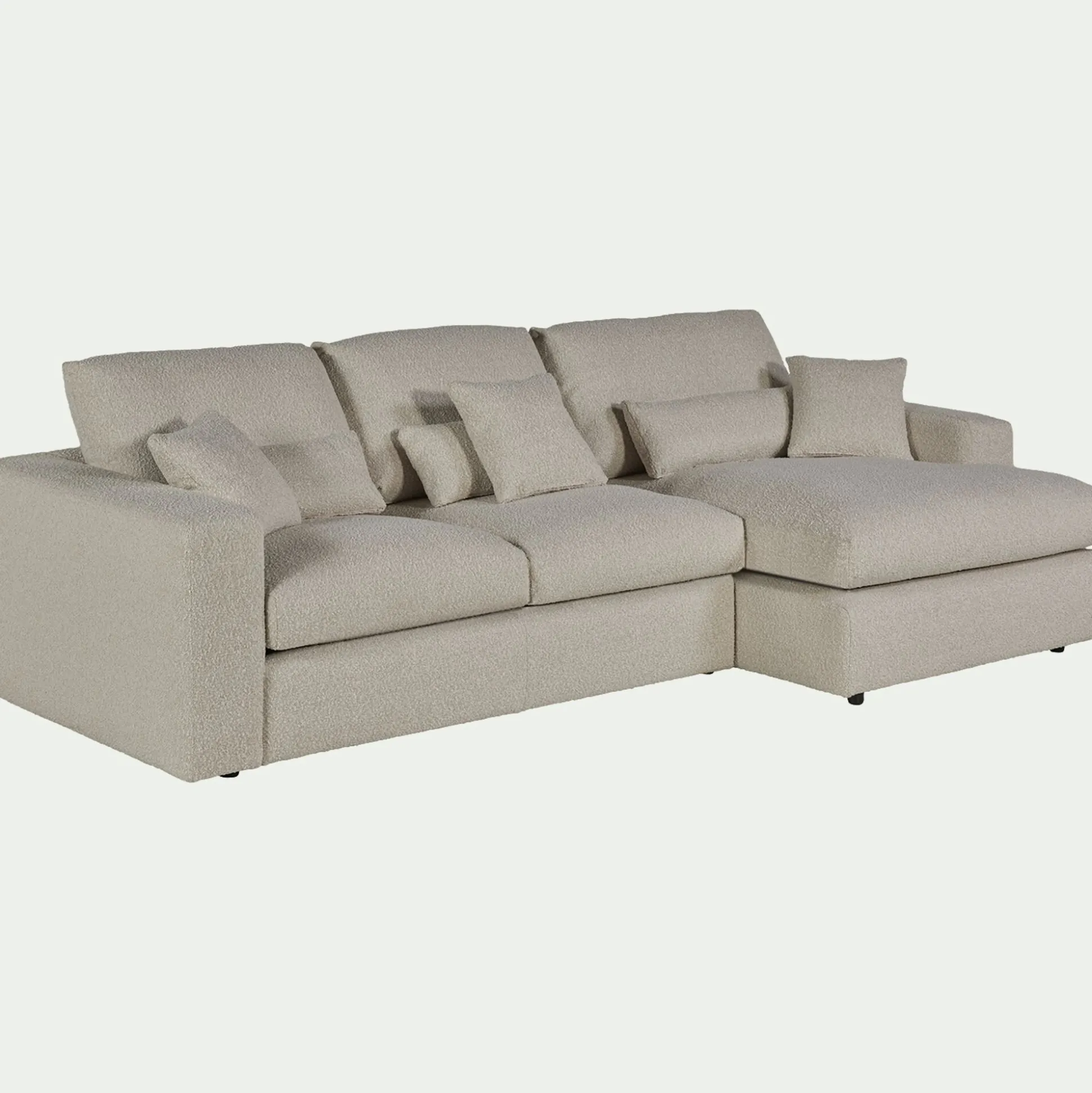 Avec son petit angle à droite, ce canapé d’angle est une invitation aux moments partagés. Son revêtement en tissu bouclette, à la fois doux et résistant, enveloppe l’espace d’une chaleur réconfortante. Son coloris blanc écru, intemporel, s’harmonise avec tous les styles d’intérieur. Pensé pour le confort, ce canapé fixe se compose d’une assise spacieuse, d’un dossier accueillant et de coussins déhoussables pour un entretien facilité. Des coussins décoratifs viennent parfaire l’ensemble, ajoutant une touche cosy. Un canapé idéal pour des instants de détente en famille ou entre amis.