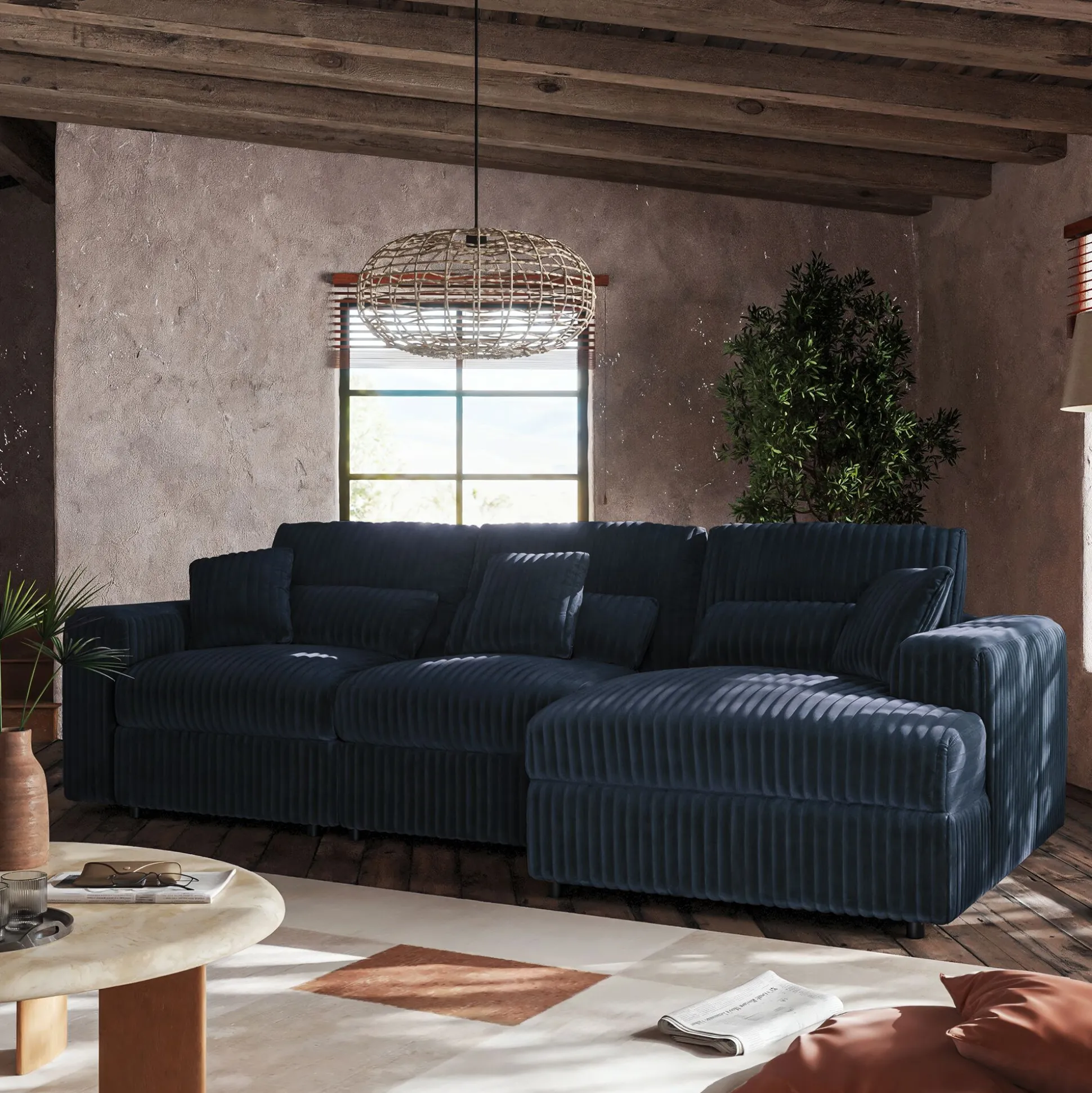 Découvrez le canapé Piuma, un concentré de douceur conçu pour votre salon. Son tissu côtelé 100% polyester bleu calabrun invite à la détente, tandis que sa structure solide en hêtre et panneaux de particules assure une belle durabilité. Les coussins déhoussables, garnis de mousse polyuréthane moelleuse et de ouate, vous promettent un confort hyper cocooning. Idéal pour les espaces plus intimes, ce canapé petit angle droit s’intègre avec charme et praticité pour créer une ambiance chaleureuse.