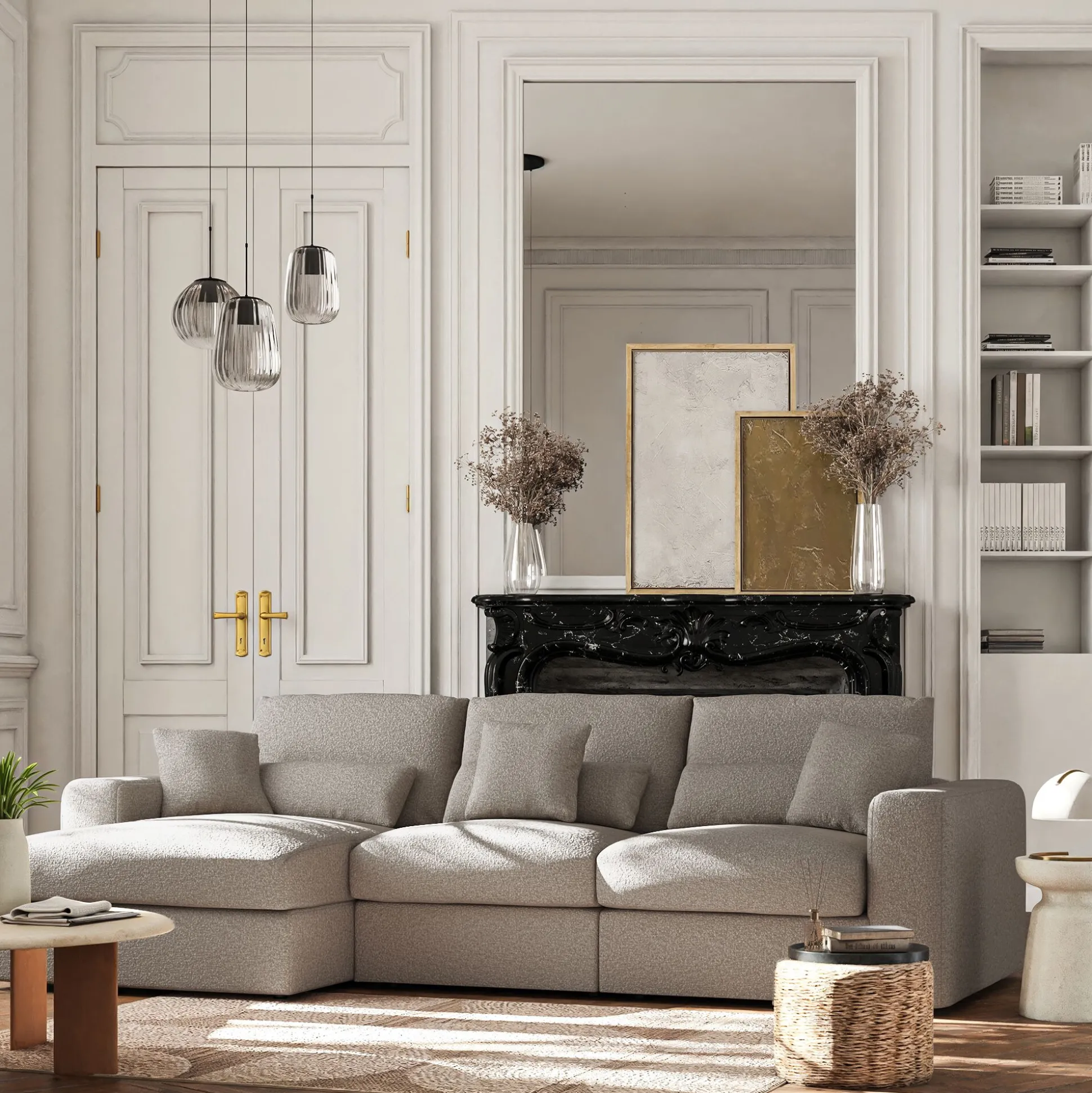 Avec son petit angle à gauche, ce canapé d’angle est une invitation aux moments partagés. Son revêtement en tissu bouclette, à la fois doux et résistant, enveloppe l’espace d’une chaleur réconfortante. Son coloris gris clair, intemporel, s’harmonise avec tous les styles d’intérieur. Pensé pour le confort, ce canapé fixe se compose d’une assise spacieuse, d’un dossier accueillant et de coussins déhoussables pour un entretien facilité. Des coussins décoratifs viennent parfaire l’ensemble, ajoutant une touche cosy. Un canapé idéal pour des instants de détente en famille ou entre amis.