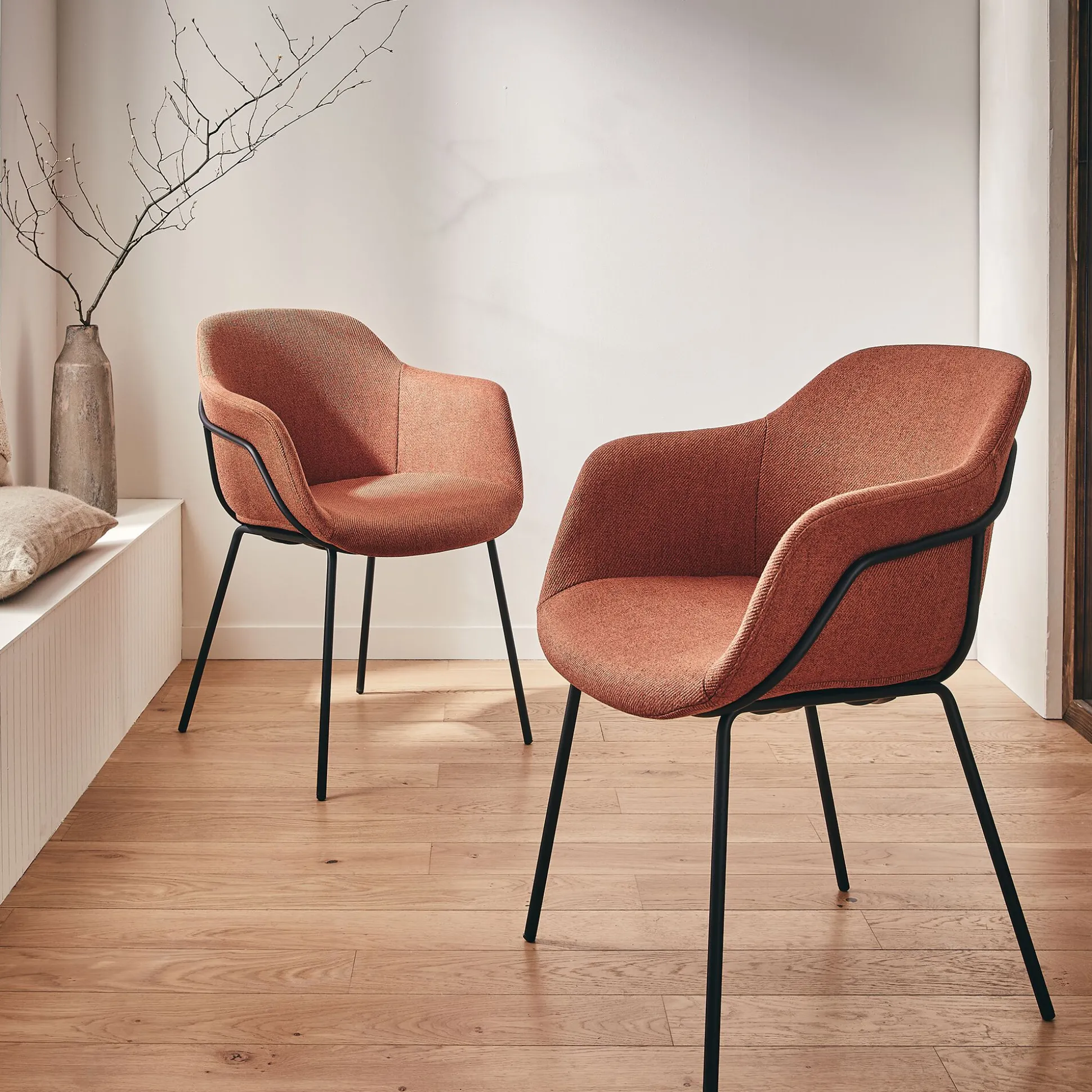 Chaleureux et profond, le coloris brun rustrel donne du caractère à la chaise Chloe. Cette nuance raffinée s’accorde parfaitement à une déco aux tons terreux ou naturels. Grâce à son tissu, ses accoudoirs intégrés et son piètement noir minimaliste, cette chaise de repas devient un vrai atout confort dans la salle à manger.