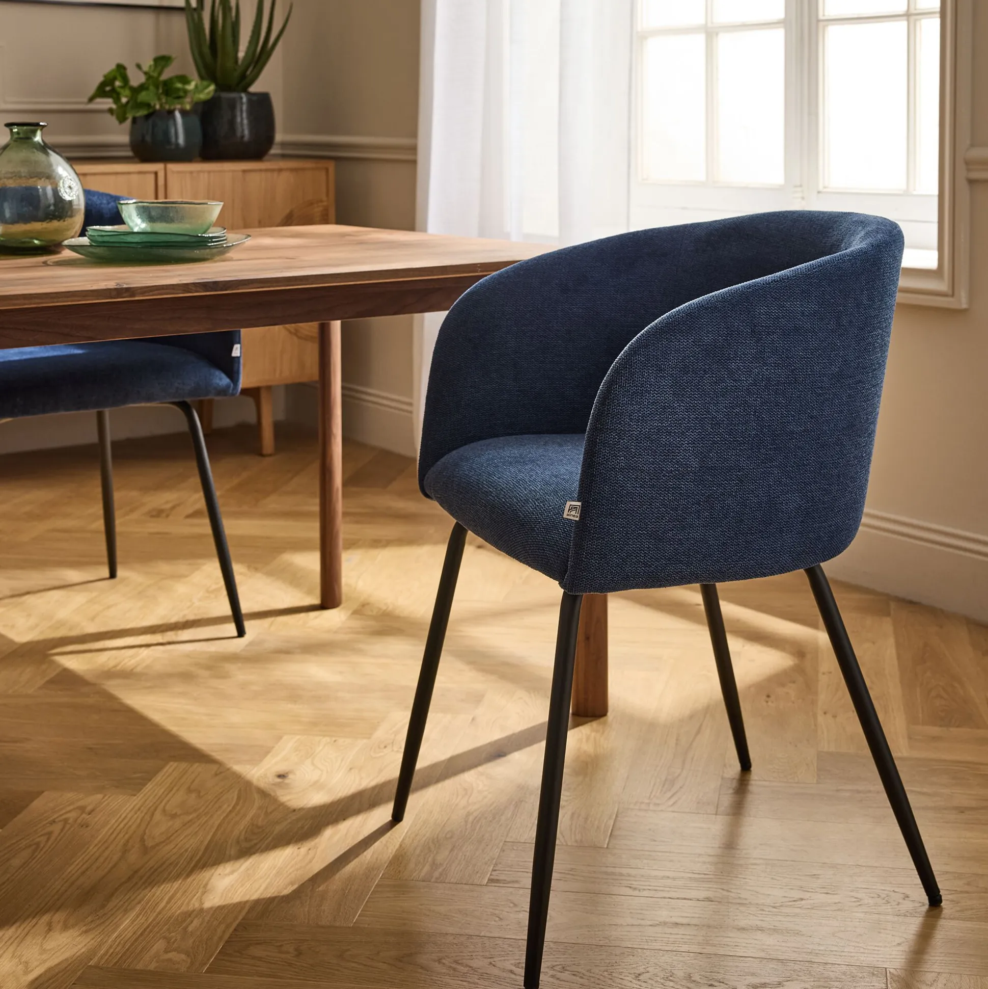 Avec son revêtement en tissu bleu figuerolles, la chaise de repas Peille évoque la profondeur apaisante des eaux méditerranéennes. Cette teinte intense contraste avec le piètement en métal noir. Dotée d’une assise confortable, d’un dossier enveloppant et de deux accoudoirs, cette chaise transforme chaque repas en moment de douceur. Une silhouette élégante, à mi-chemin entre la chaise et le fauteuil.