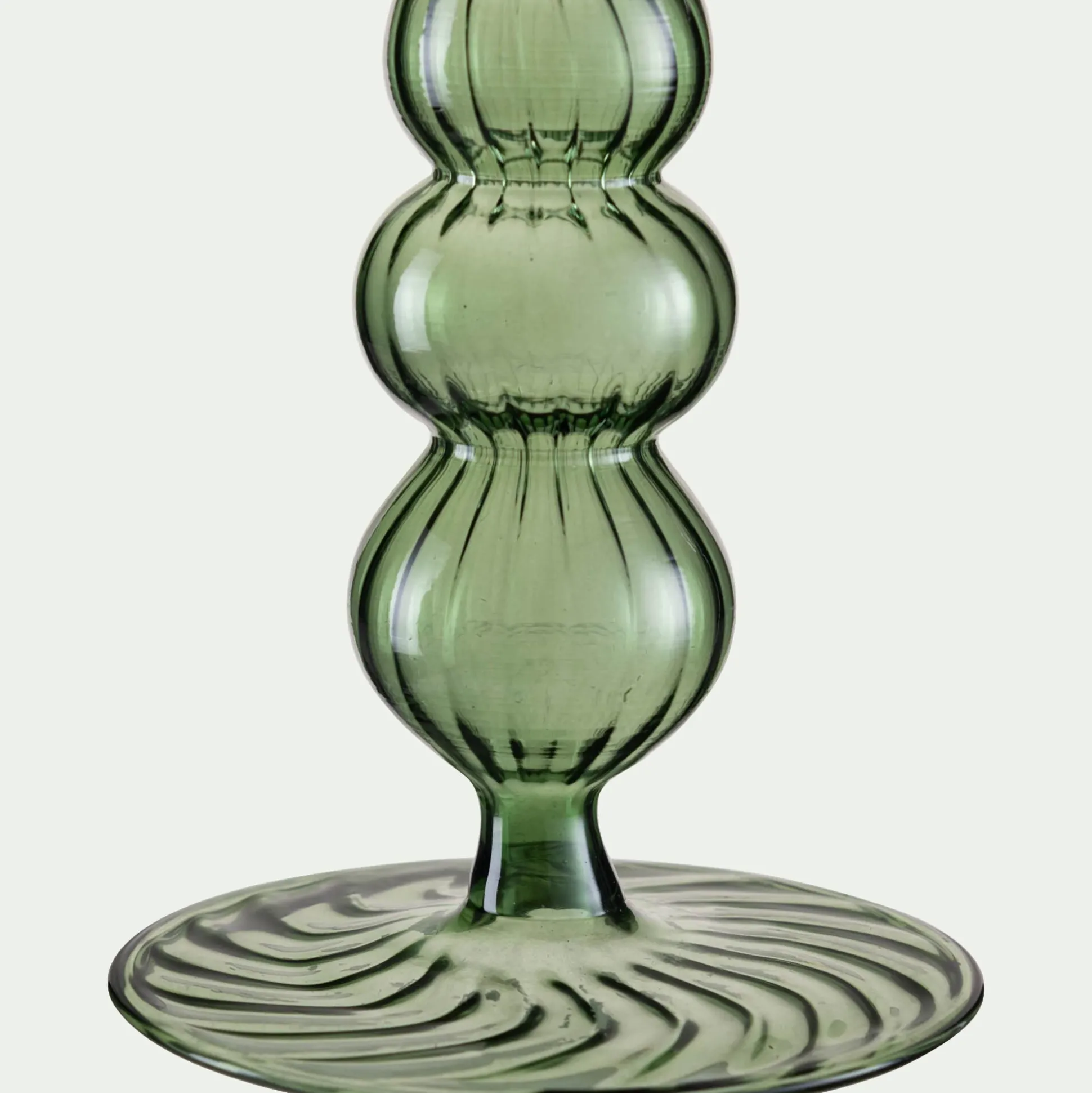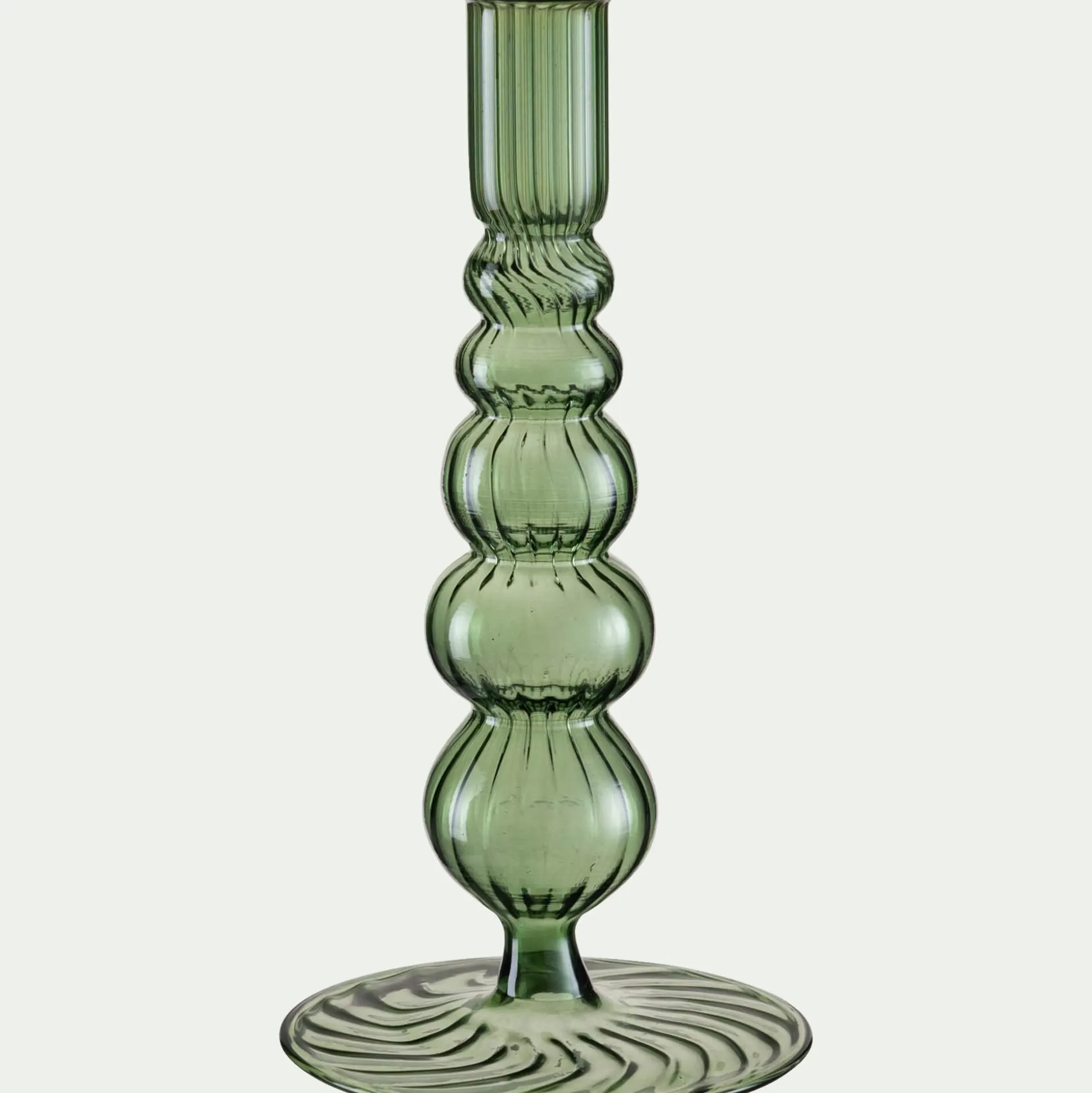Ce chandelier en verre capte la lumière avec raffinement grâce à ses nombreux détails : stries délicates, courbes généreuses et reliefs travaillés. Pensé pour accueillir une bougie flambeau, ce chandelier vert apporte une note d’élégance à la décoration de Noël. Parfait sur une table de fête, il diffuse une atmosphère chaleureuse et scintillante.