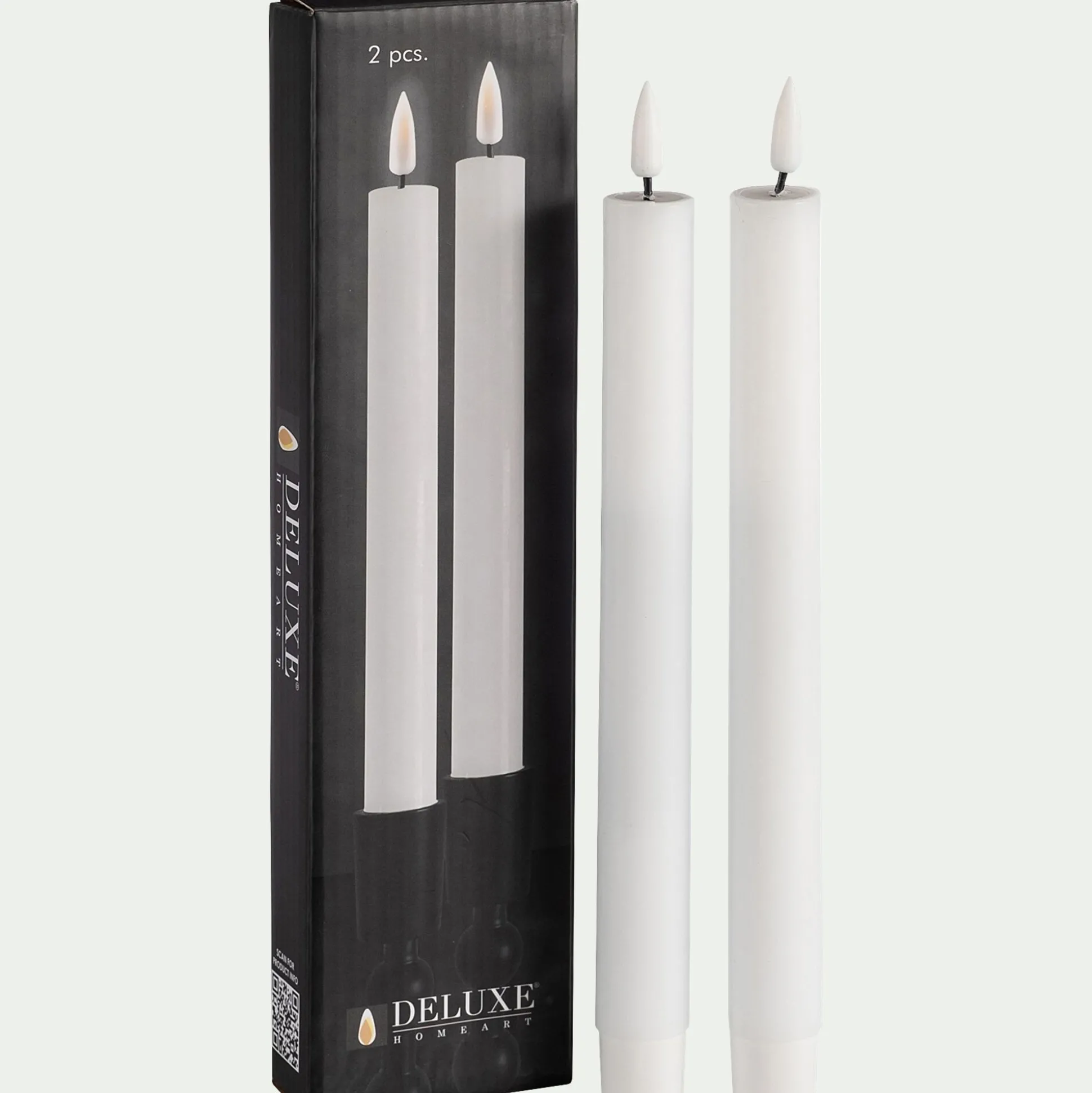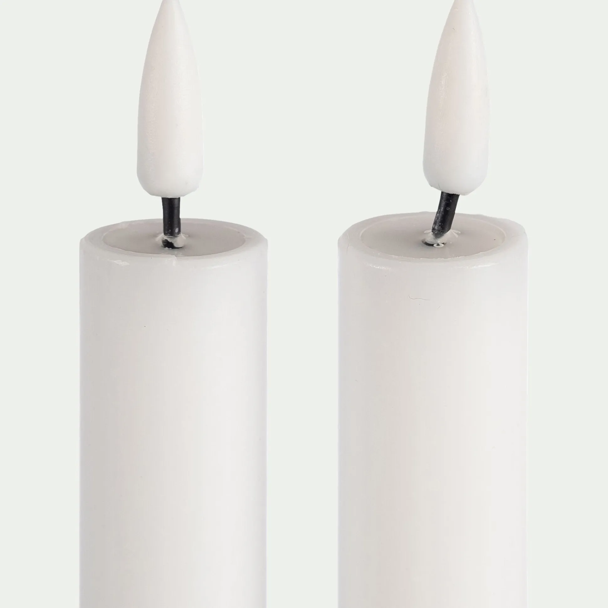 Laissez-vous séduire par ces 2 jolies chandelles à LED. Elles arborent un design élégant et classique, ainsi qu’une technologie LED moderne pour un produit durable. Fabriquée en paraffine, chacune de ces chandelles est munie d’une mèche en plexiglas, contenant une LED blanc chaud pour une lueur de charme. D’une couleur blanche, elles seront la touche finale parfaite pour votre dressage de table lors de repas de fêtes ou autres occasions. Associez ces chandelles LED à piles avec les chandeliers appropriés afin de créer un bel élément déco pour votre table.