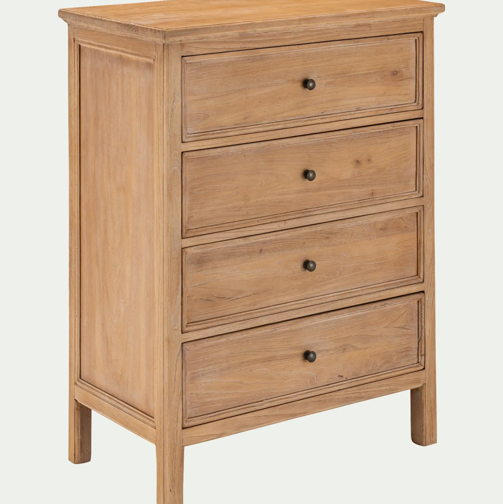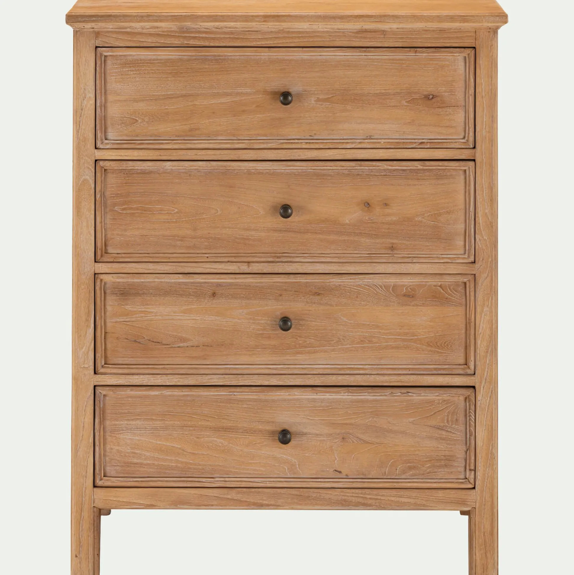 La commode Alysse allie charme rustique et format pratique. Confectionnée en bois d’orme et de pin, elle séduit par ses moulures travaillées et son esprit authentique. Haute de 110 cm pour une largeur de 85 cm, elle occupe peu de place tout en offrant un bel espace de rangement grâce à ses 4 tiroirs. Idéale dans une petite chambre, elle apporte chaleur et caractère à la pièce.