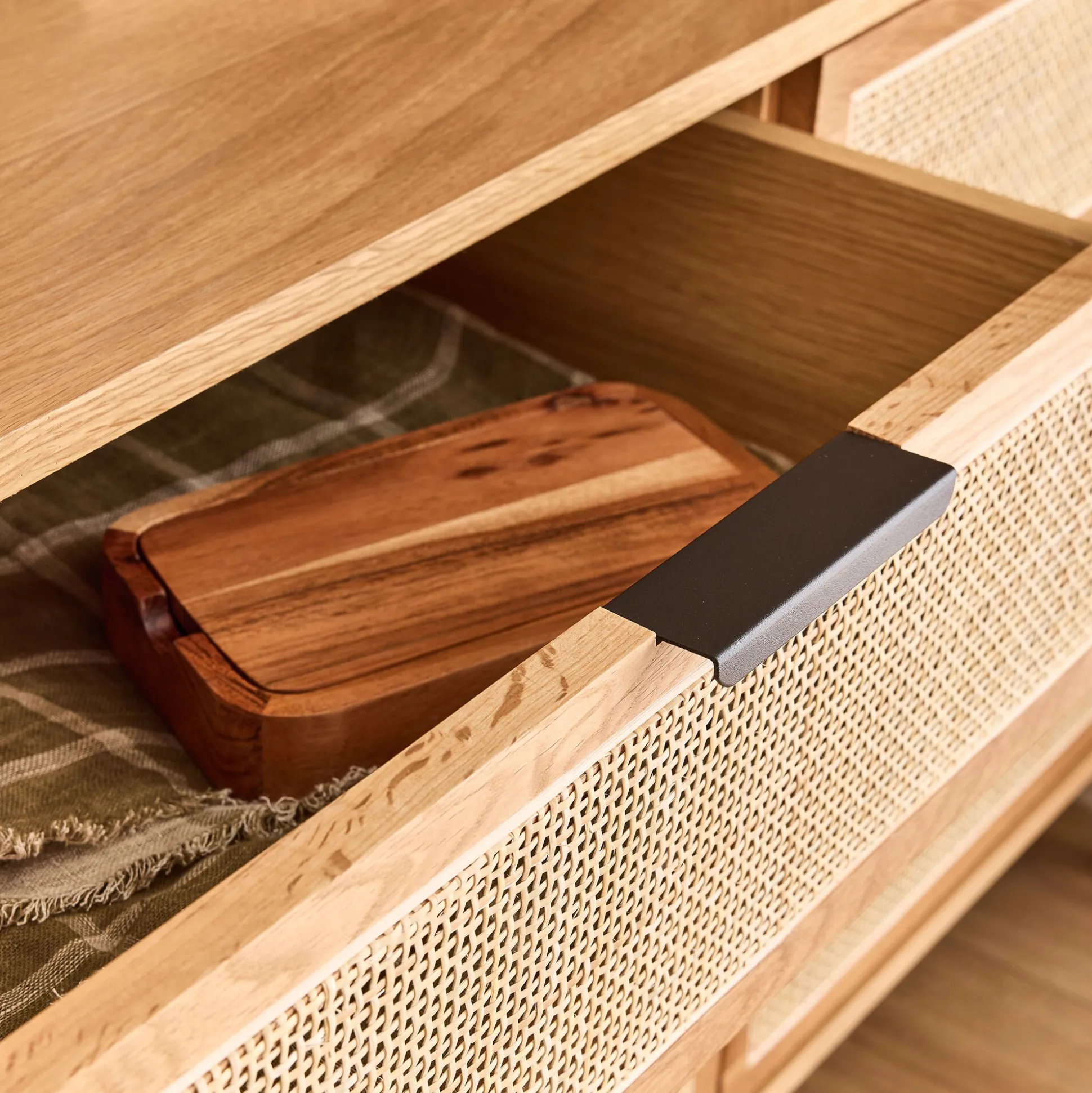 Chêne et MDF chêne plaqué, façade des tiroirs en canne naturelle.