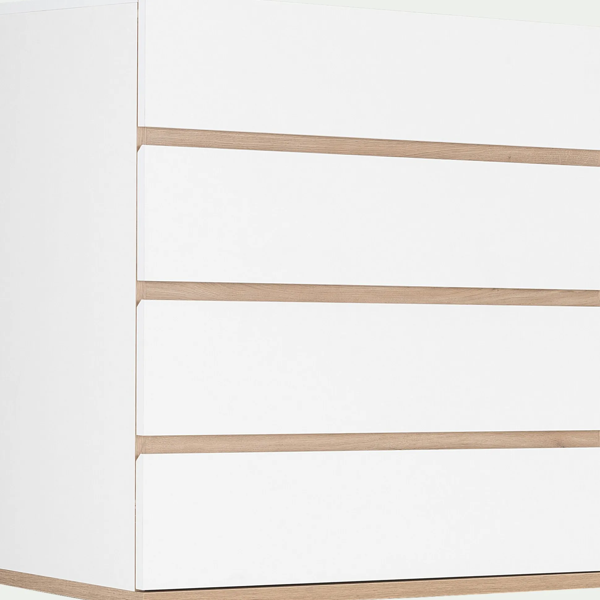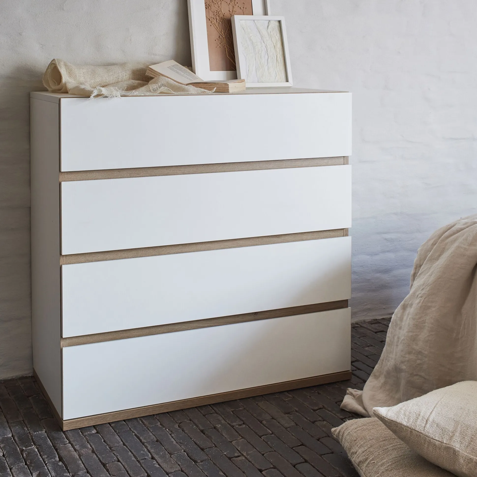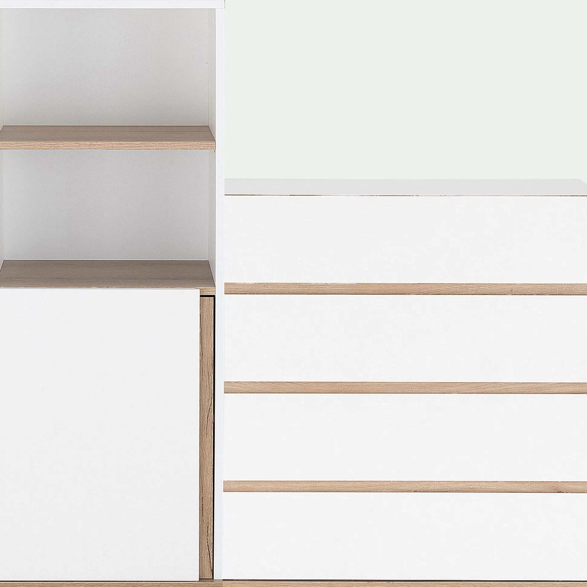 Découvrez donc le module avec quatre tiroirs, de couleur blanche où vous pouvez ranger vos vêtements et autres affaires. Vous pouvez acheter cette pièce seule ou associée à un des éléments de la gamme. Chaque module est indépendant, mais ils se complètent aussi parfaitement entre eux. Ce sont des produits de qualité qui vous sont proposés, avec une finition en mélanine et une impression effet bois au toucher. Résistants, ces meubles dureront dans le temps. Le montage de ces derniers est très aisé et se fait en vertical. Les coins des modules sont découpés afin de laisser passer les plinthes et que vous puissiez placer vos meubles contre le mur.