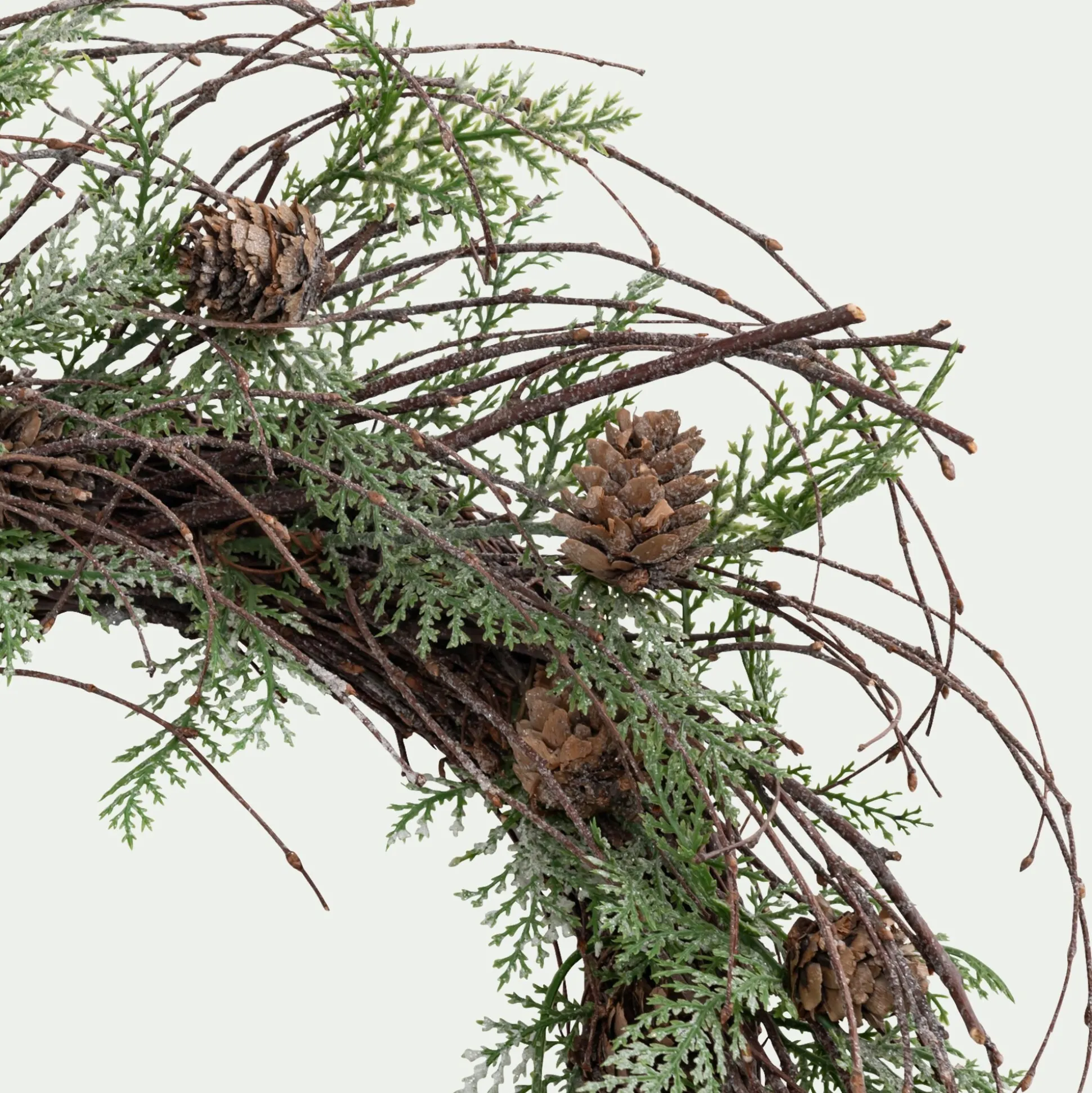 Cette couronne de Noël naturelle se distingue par sa composition. De véritables pommes de pin se succèdent pour former cette couronne épaisse et authentique. Alors que certaines pignes gardent leur couleur naturelle, d’autres sont blanches pour évoquer le givre hivernal. Un détail déco qui s’accorde parfaitement à la saison de Noël. Cette couronne naturelle apportera du cachet à l’embrassure de votre porte ou à votre chemin de table.