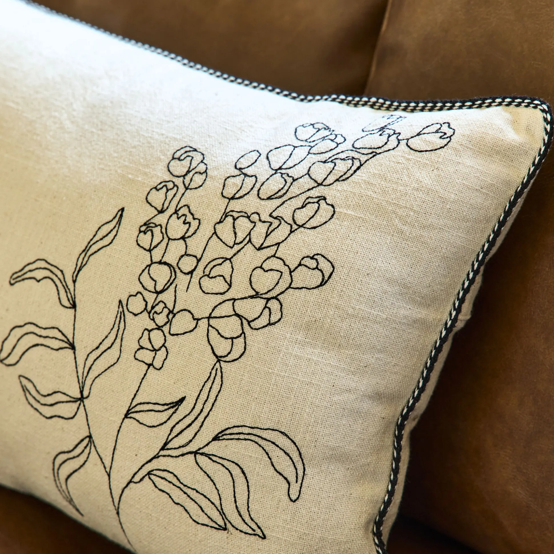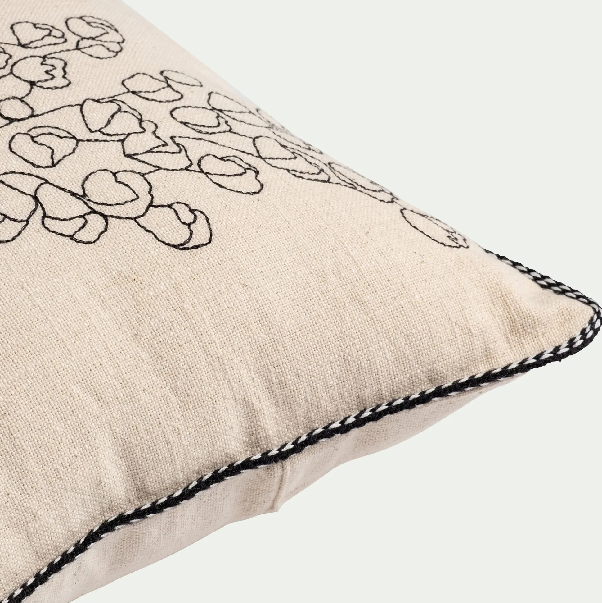 Le coussin Lilane mise sur la délicatesse des détails et l’élégance naturelle des matières. Rectangulaire (30×50 cm), il est habillé d’une housse en coton Oeko-Tex non teinté, qui laisse apparaître la couleur brute de la fibre. Un motif floral brodé en noir vient se poser sur ce fond neutre, créant un contraste raffiné et intemporel. Le tout est souligné par une finition passepoil qui encadre joliment la silhouette du coussin.
