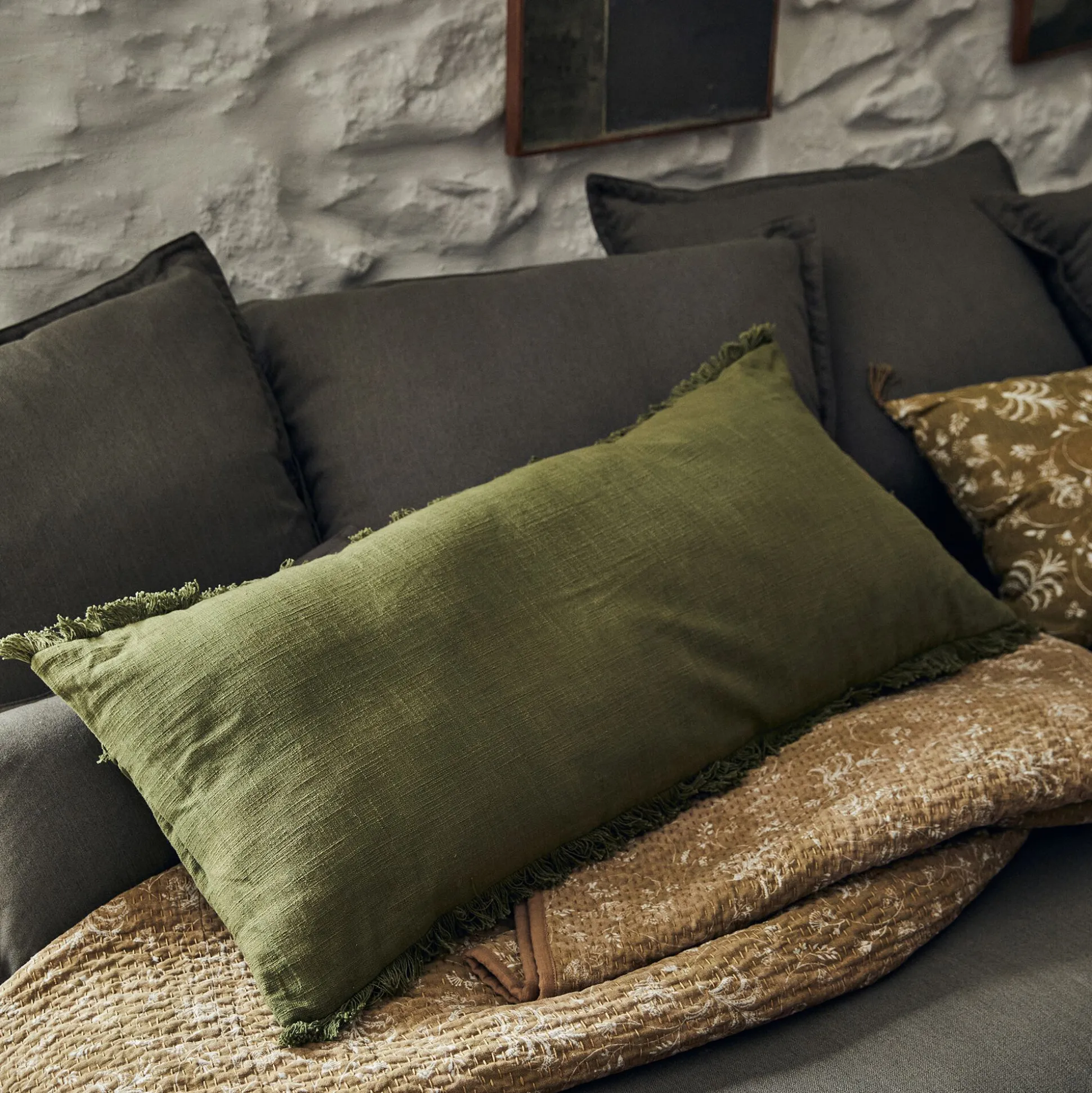 Apportez une touche de couleur à votre décoration avec ce grand coussin rectangulaire de 40×90 cm. Ce coussin déco nous séduit par ses formes généreuses et son vert profond. Cette nuance, appelée vert garrigue, participe à une atmosphère puissante et rassurante. Véritable anti-stress, le vert crée un sentiment de confort et de détente bienvenue dans le séjour. Ce coussin vert se compose d’une housse en coton et d’un garnissage moelleux. De courtes franges viennent souligner ses courbes et lui apporter fraîcheur et vitalité.