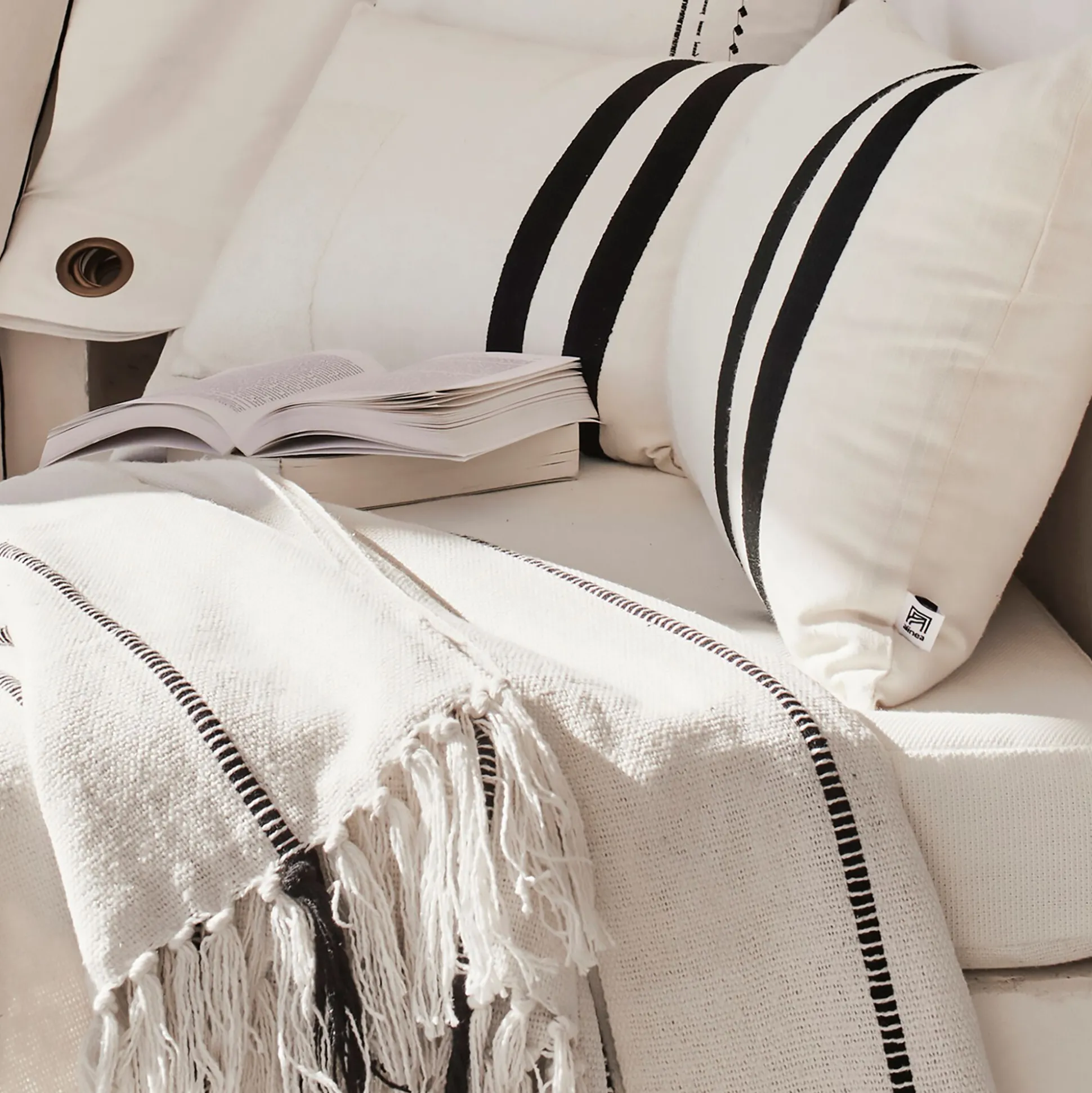 A la fois confortable et décoratif, le coussin Tilva est parfait sur votre canapé. Ce coussin rectangulaire se compose d’une housse 100% coton et d’un garnissage épais adapté. Déhoussable, ce coussin déco se lave aisément en machine. Il arbore une couleur lumineuse et intemporelle : le blanc. Cette tonalité éclatante s’associe à tous les types de décoration. Cette belle housse est ponctuée de deux épaisses rayures noires, un détail simple qui permet de jouer le contraste. Ce coussin rayé présente une finition tuftée sur un angle, un effet moutonné qui apporte de la texture à l’ensemble. Ce coussin à motifs de 30×50 cm vous accompagne lors de vos moments de détente pour un plaisir décuplé.