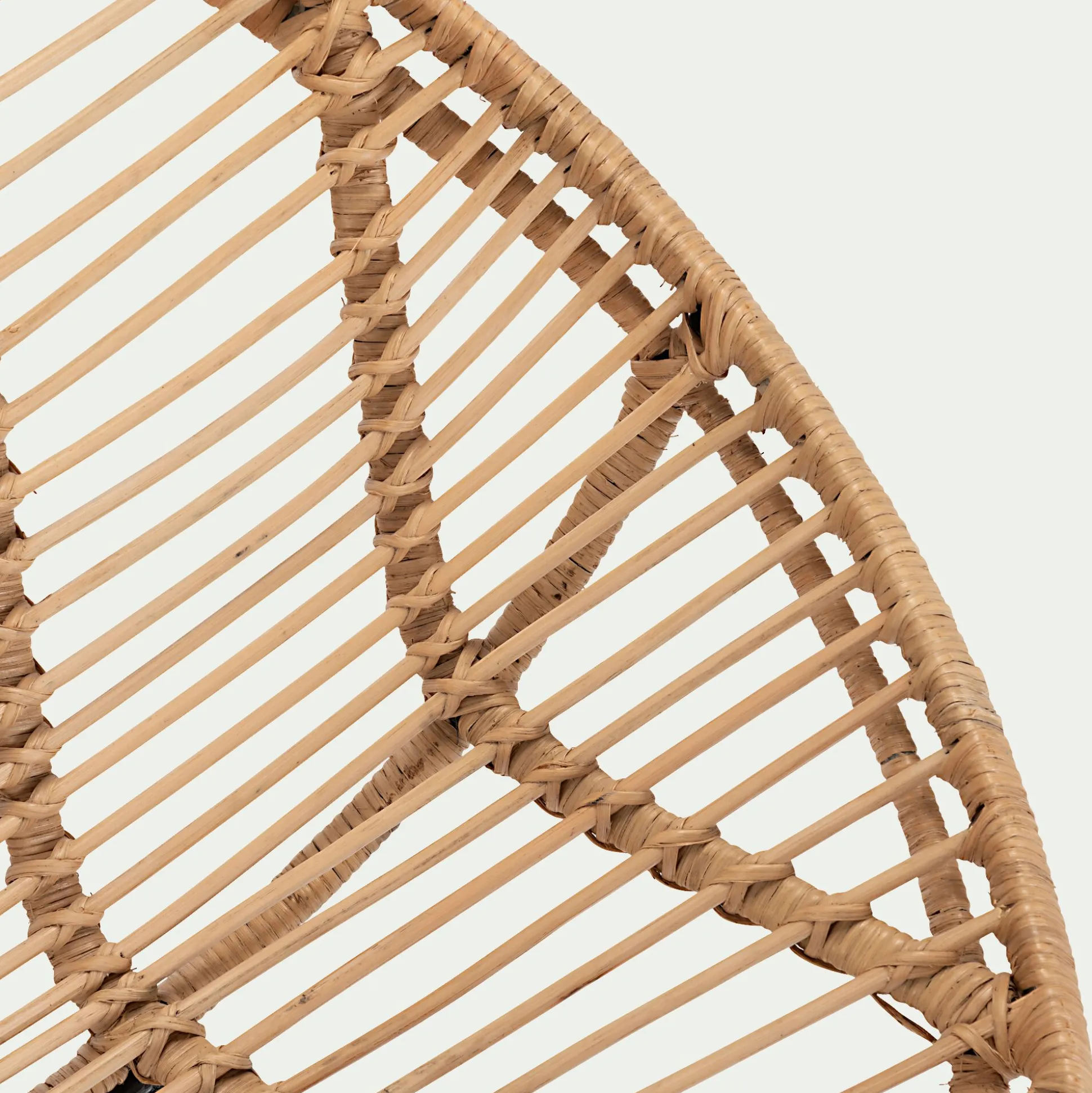 Ce fauteuil en rotin arbore une forme ronde, emplie de douceur. Le rotin enveloppe la structure en métal. Ce travail minutieux offre une assise en forme de coupole, une belle forme organique qui fait naître une atmosphère cocooning. Cette assise naturelle repose sur un piétement en métal filaire. Le design est simple et apporte une touche de modernité. Rotin et métal noir se marient ensemble pour proposer un fauteuil aux accents nomades. Ce fauteuil en rotin se place dans un salon, près du canapé, ou bien dans une salle à manger. Il complète parfaitement une table dans le cadre d’une déco dépareillée, très tendance. Brut ou agrémenté de quelques coussins, il offre confort et style à votre intérieur.