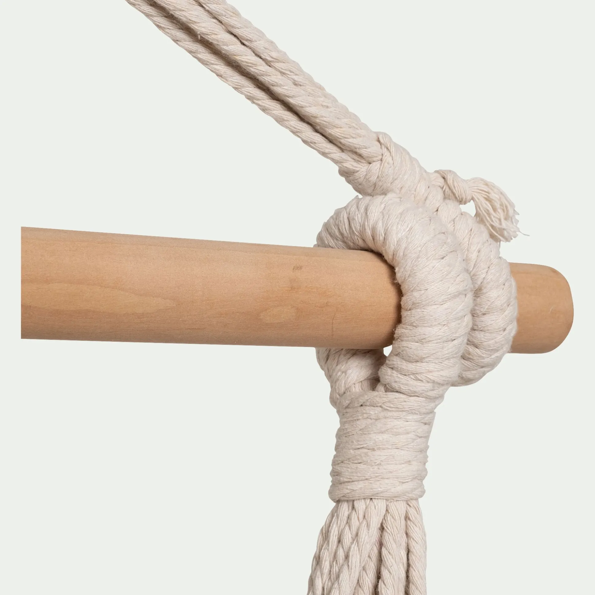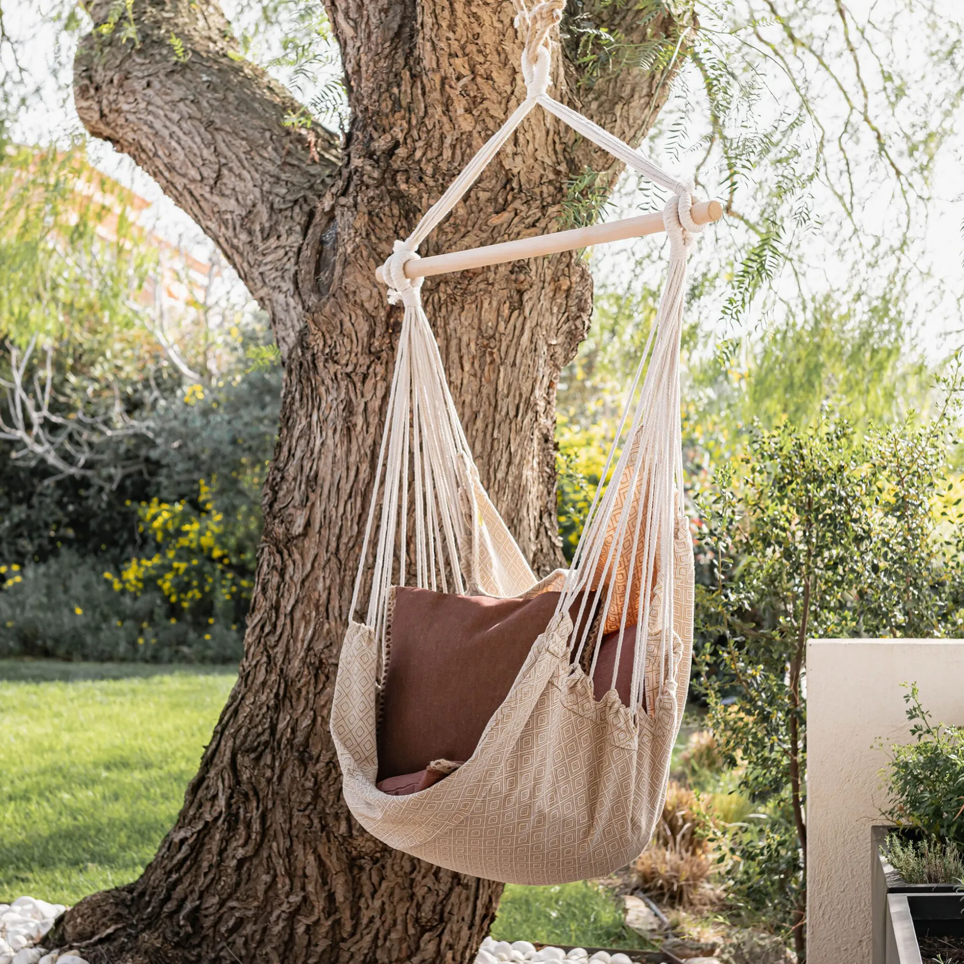 Offrez-vous une bulle de sérénité avec la chaise suspendue Cinto, parfaite pour le jardin. Accrochée grâce à un épais cordage robuste, elle garantit sécurité et stabilité. Ce fauteuil suspendu est pensé pour le confort, avec son assise généreuse et ses deux coussins moelleux qui invitent à la détente. Véritable cocon, cette chaise suspendue de jardin est idéale pour s’évader avec un bon livre ou simplement profiter d’un moment de calme. Le tissu arbore un motif géométrique raffiné : des losanges beiges, qui ajoutent une touche de douceur et d’élégance à votre espace extérieur.