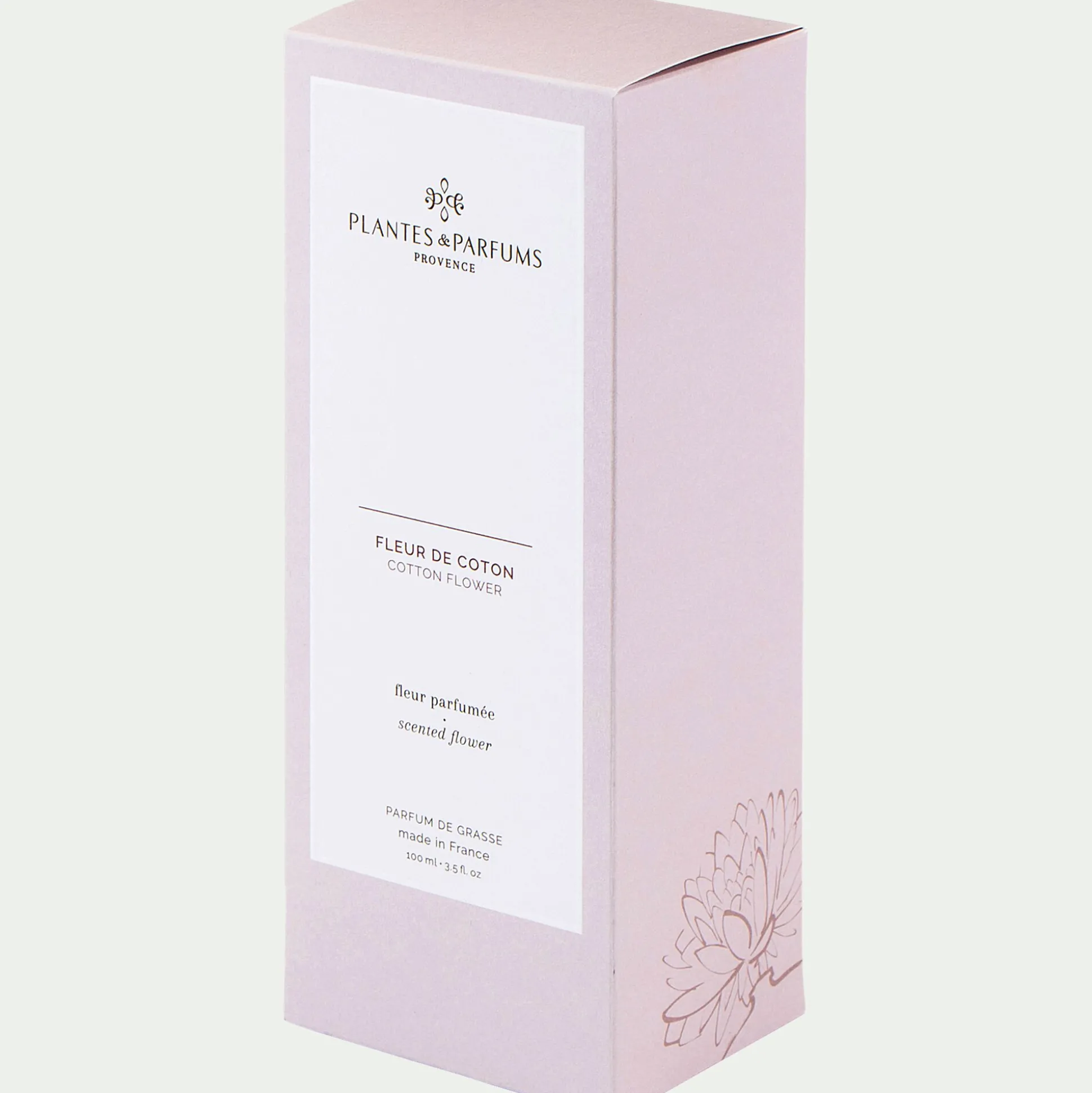 Prolongez cet instant suspendu où le bien-être règne en maître grâce à la fleur parfumée Fleur de Coton. Cette fragrance poudrée associe les notes cotonneuses de la framboise et d’accord vert à celles plus charnelles et sucrées des fleurs blanches. Un parfum aux mille effluves relevé par l’odeur du musc, du cèdre et de l’héliotrope, plus complexe et boisée. En résulte un parfum frais et délicat qui évoque l’iris et la soie.