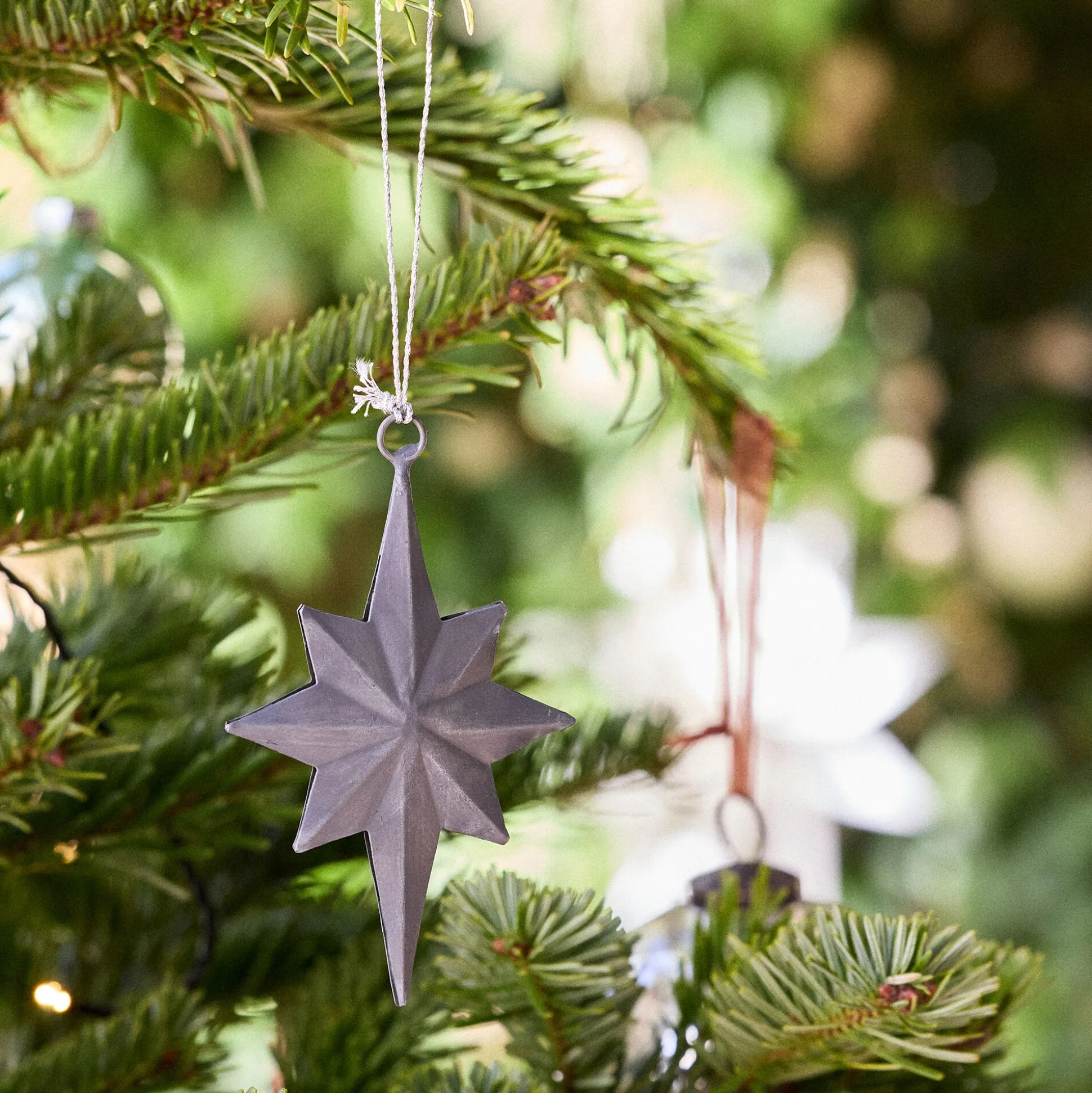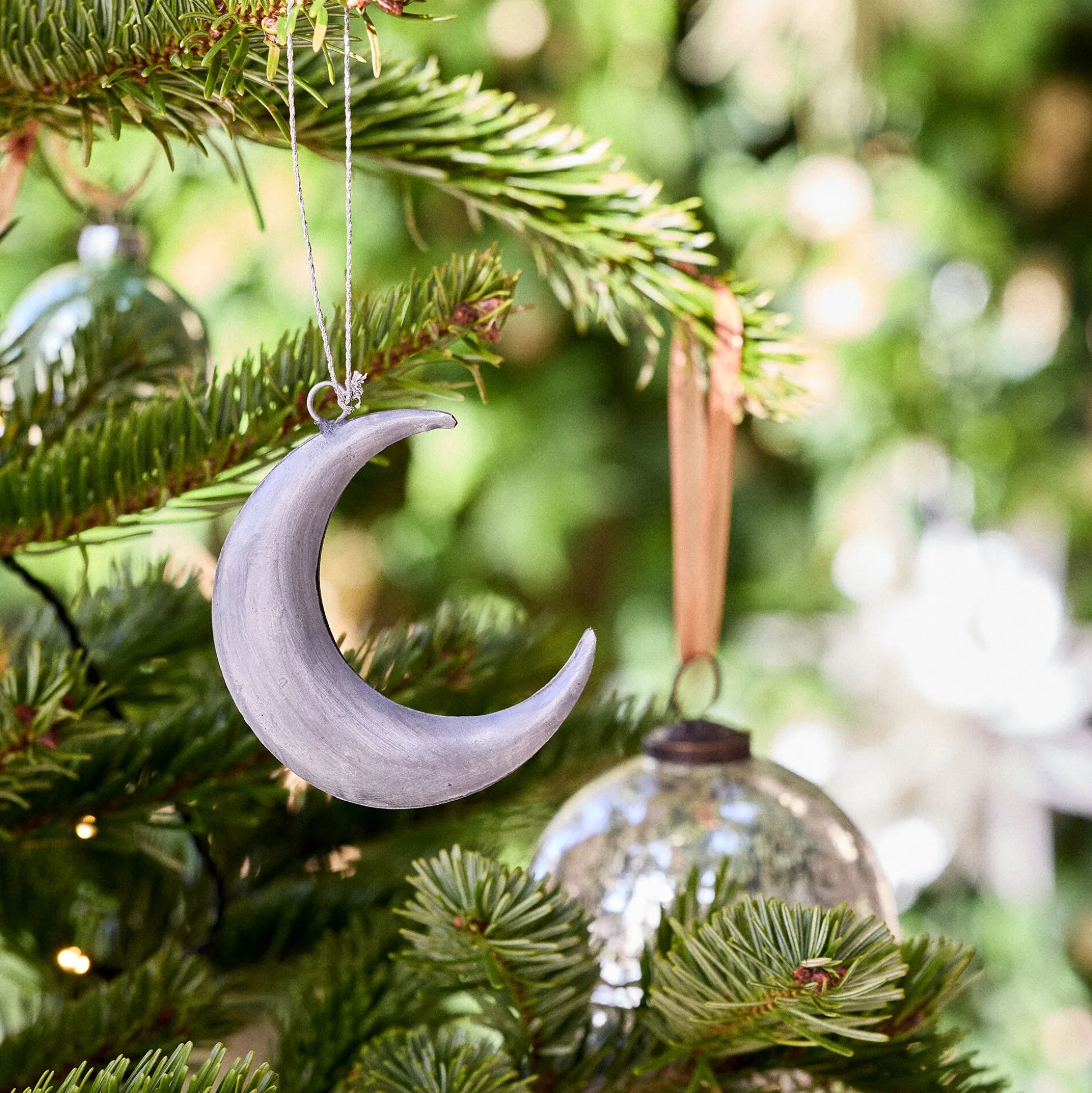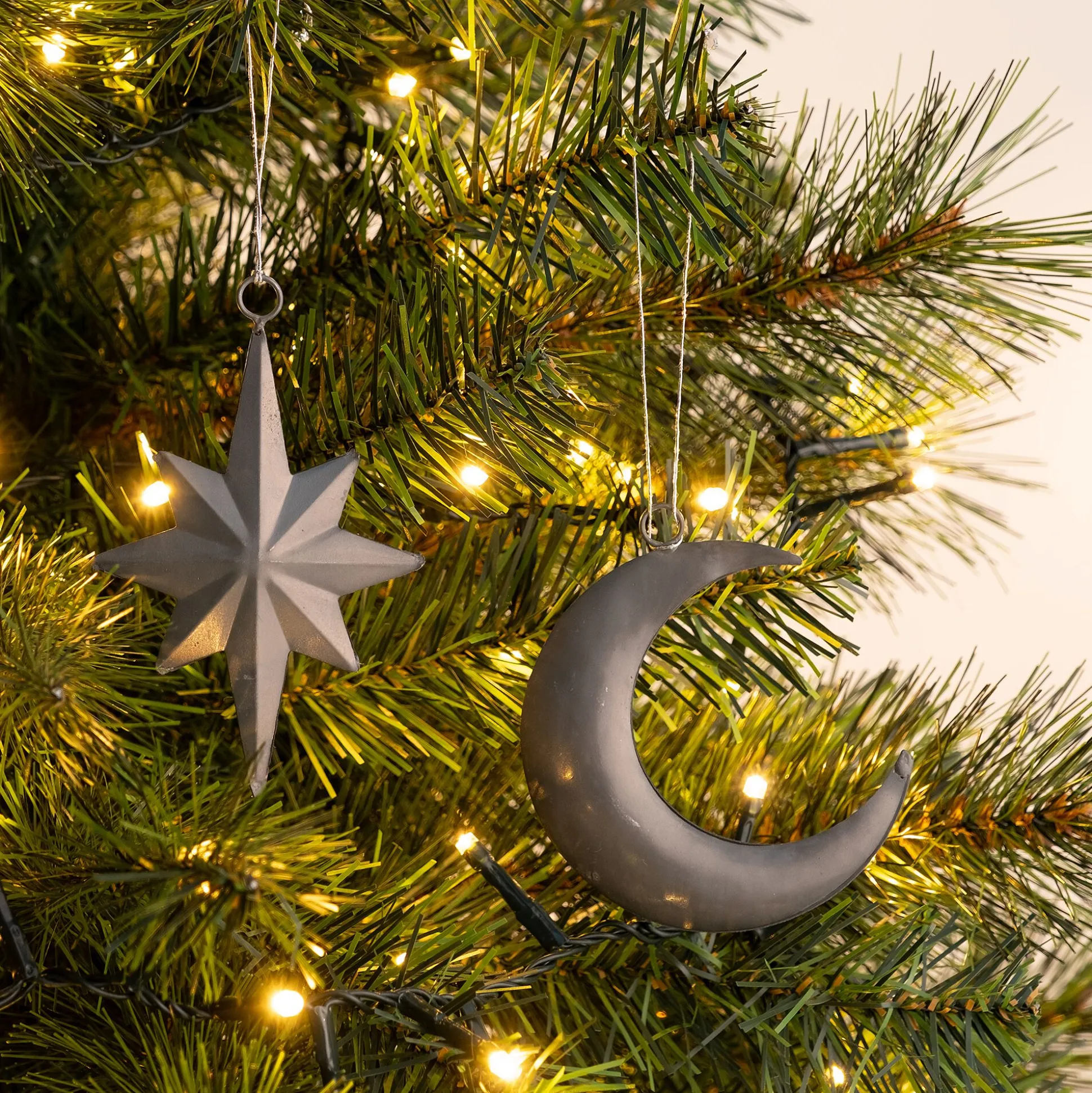 Ce Noël, craquez pour le lot de 2 suspensions Osseja. Cette décoration de Noël se compose d’une étoile à 8 branches et d’un croissant de lune. Cette belle nuit étoilée est confectionnée en fer, un métal argenté qui évoque les mystères du soir. À suspendre dans le sapin, ces décorations apportent une note douce et mystique.