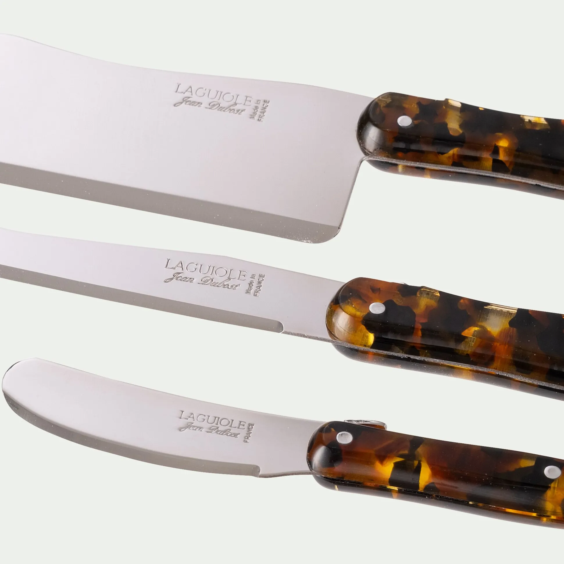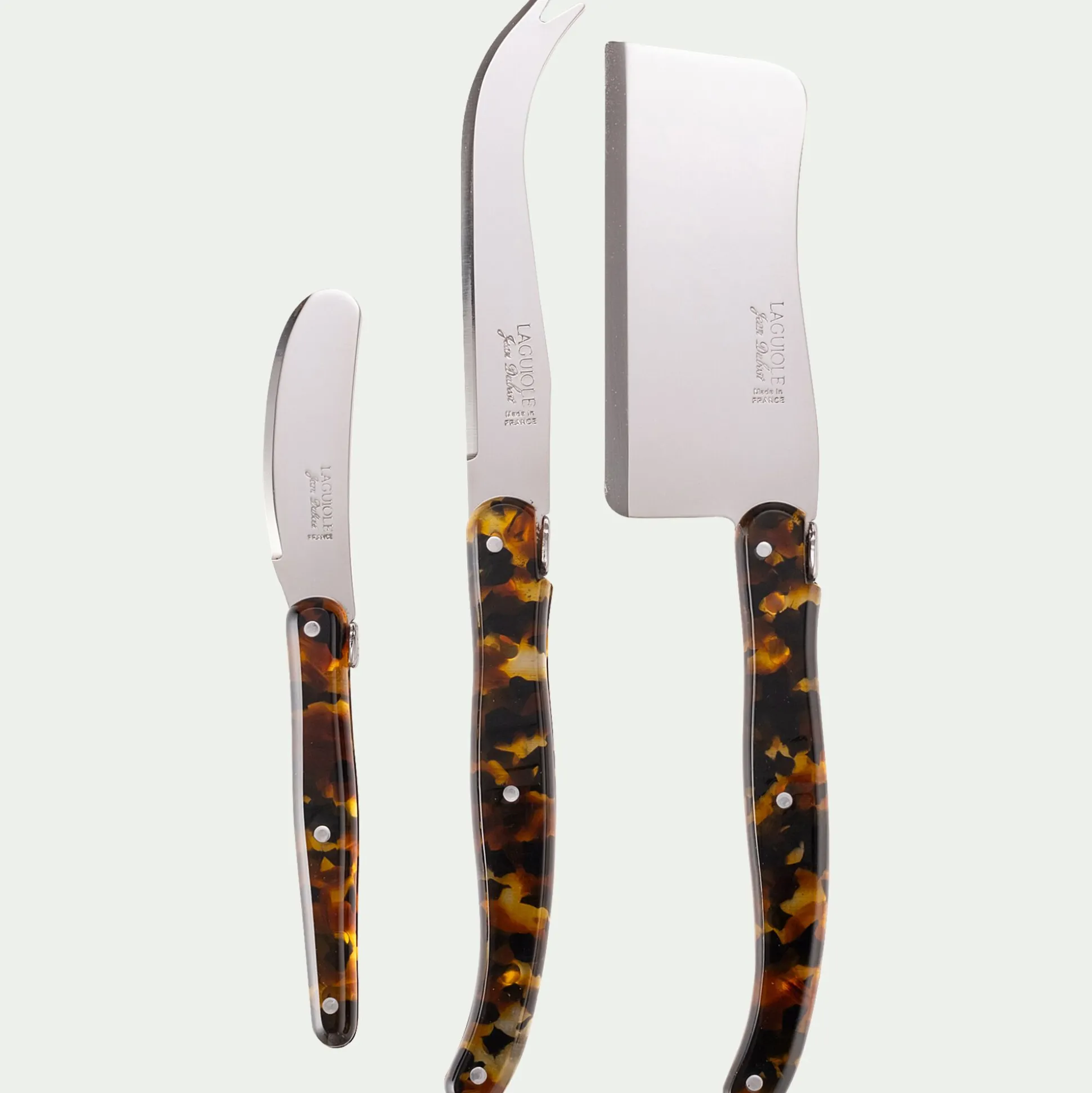 Ce coffret Laguiole comprend trois couteaux à fromage complémentaires : un couteau à lame fine, un tartineur et un couperet pour les pâtes plus dures. Leurs lames en inox assurent une coupe nette et précise, tandis que les manches au design écaille de tortue apportent une touche d’élégance vintage à la table. Fabriqués en France, ces couteaux allient savoir-faire et raffinement pour sublimer chaque dégustation de fromage.