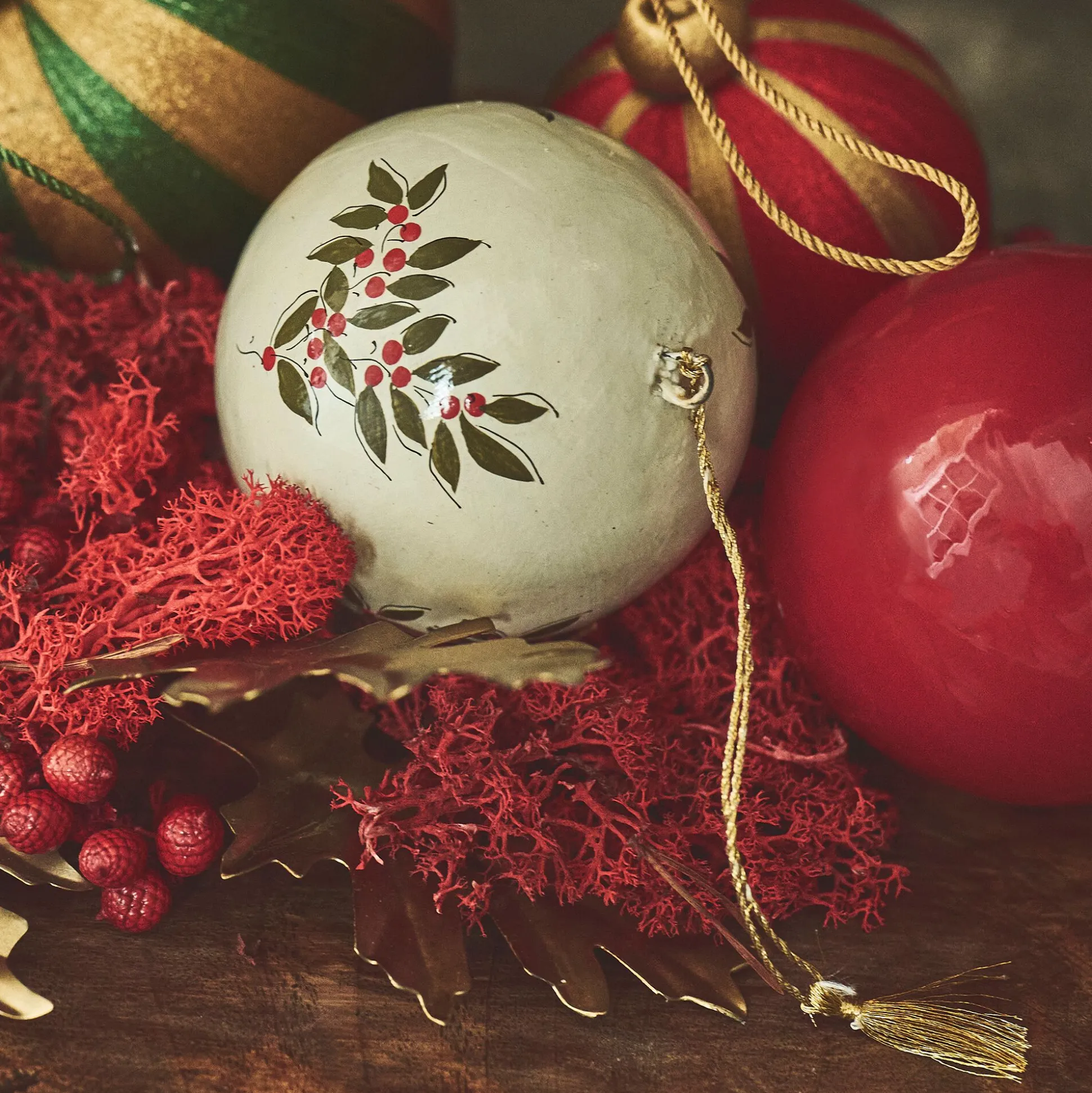 Ce lot de boules de Noël en papier mâché capture l’esprit des fêtes avec son motif végétal peint à la main. Sur sa base blanche, des branches de houx se déploient, ornées de feuilles vertes et de baies rouges. Ce symbole incontournable de Noël évoque la magie et la tradition des fêtes de fin d’année. Suspendues dans le sapin, ces boules rondes apportent une touche de fraîcheur naturelle.