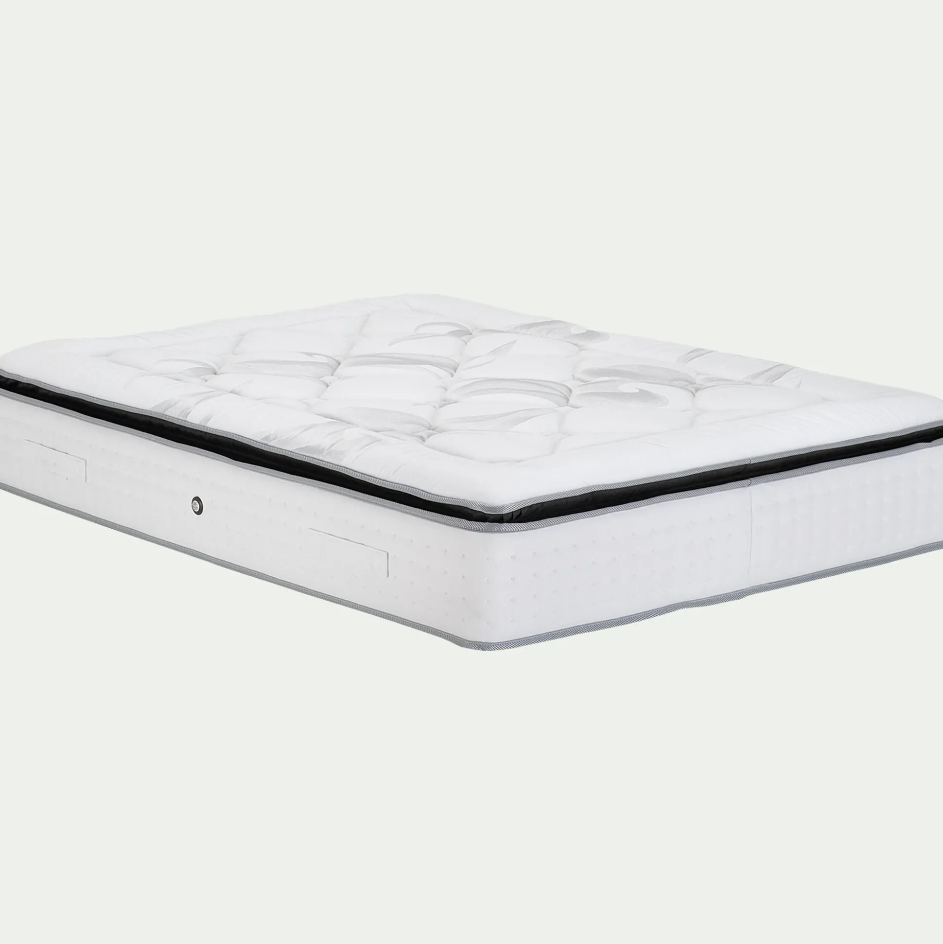 Un matelas 180×200 cm confortable, muni d’un accueil douillet en mousse haute résilience et garni de latex. Ce matelas à ressorts est d’un confort exceptionnel. Ses ressorts ensachés sont indépendants les uns des autres et répartis en 5 zones distinctes afin d’offrir une indépendance de couchage exceptionnelle. Ainsi, ils s’adaptent à chaque partie de votre corps et épousent parfaitement votre morphologie. Sa surface piquée à la main par des français passionnés est revêtue d’une nappe de soie pour toujours plus de douceur lors de votre sommeil. Un matelas au raffinement digne des plus grands hôtels qui vous promet des nuits luxueusement douces et réparatrices.