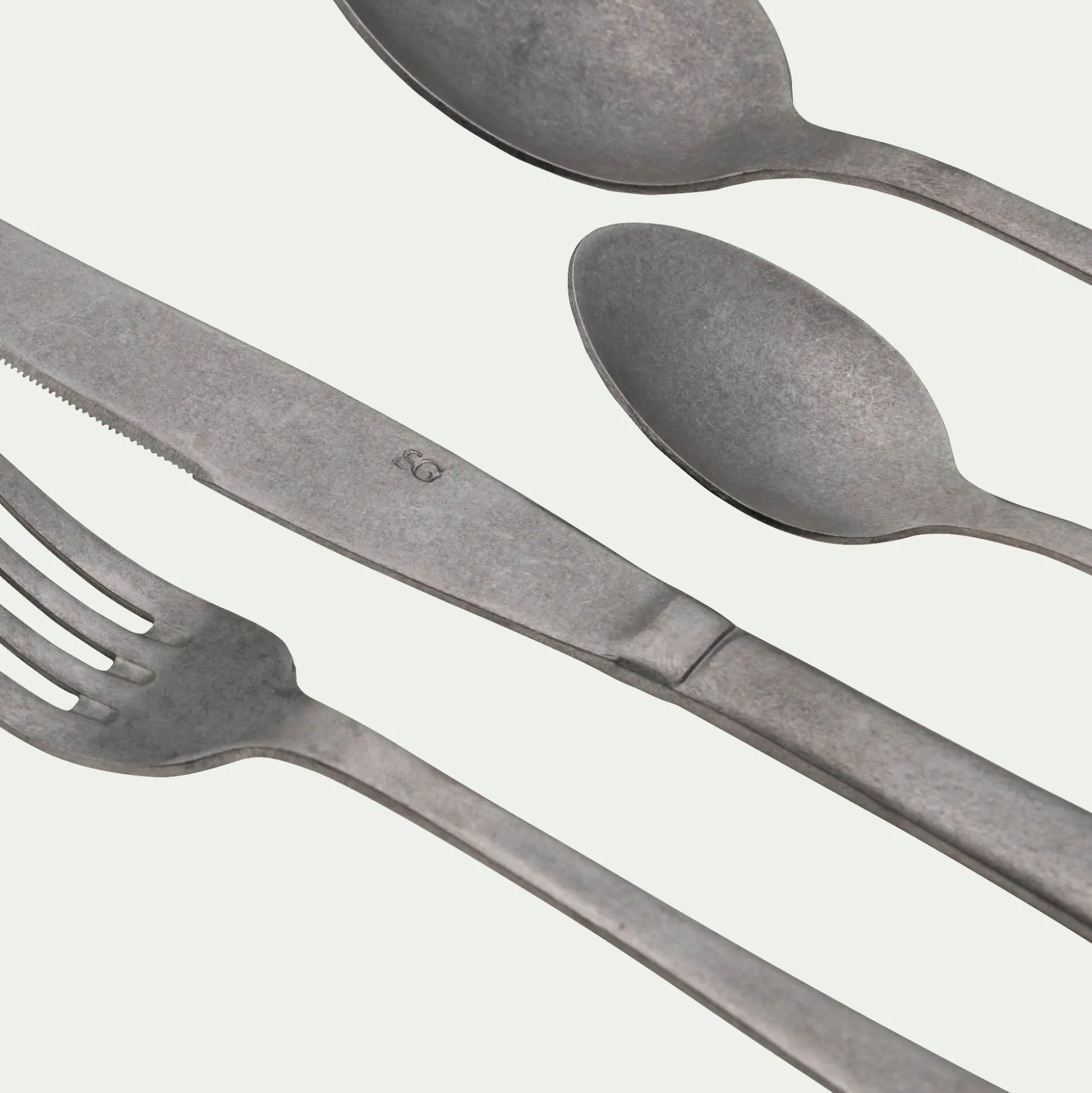 Sublimez vos repas avec cette ménagère 16 pièces au style affirmé et intemporel. Composée de 4 fourchettes, 4 couteaux, 4 cuillères à soupe et 4 petites cuillères, elle séduit par son design épuré et sa finition gris vieilli au rendu authentique. Confectionnés en acier inoxydable, ces couverts allient robustesse et originalité pour une table à la fois moderne et pleine de caractère. Ils s’invitent aussi bien au quotidien que lors de vos plus beaux dîners.