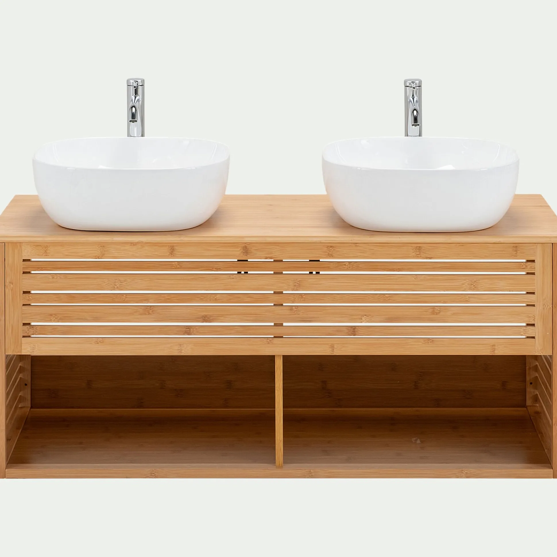 Indispensable dans la salle de bain, le meuble sous vasque habille l’espace et donne le ton à la décoration. De 120 cm de long, ce double meuble sous vasque permet d’accueillir deux lavabos : un critère indispensable pour les couples et les familles nombreuses. L’installation est parfaitement dissimulée derrière des lattes en bois pour une salle de bain élégante et ordonnée. Ce meuble sous vasque en bambou présente deux niches de rangement ouvertes afin d’entreposer vos serviettes de toilette, vos soins ou encore de la décoration. Avec ses matériaux et son coloris naturels, ce meuble de salle de bain participe à une atmosphère zen et reposante.