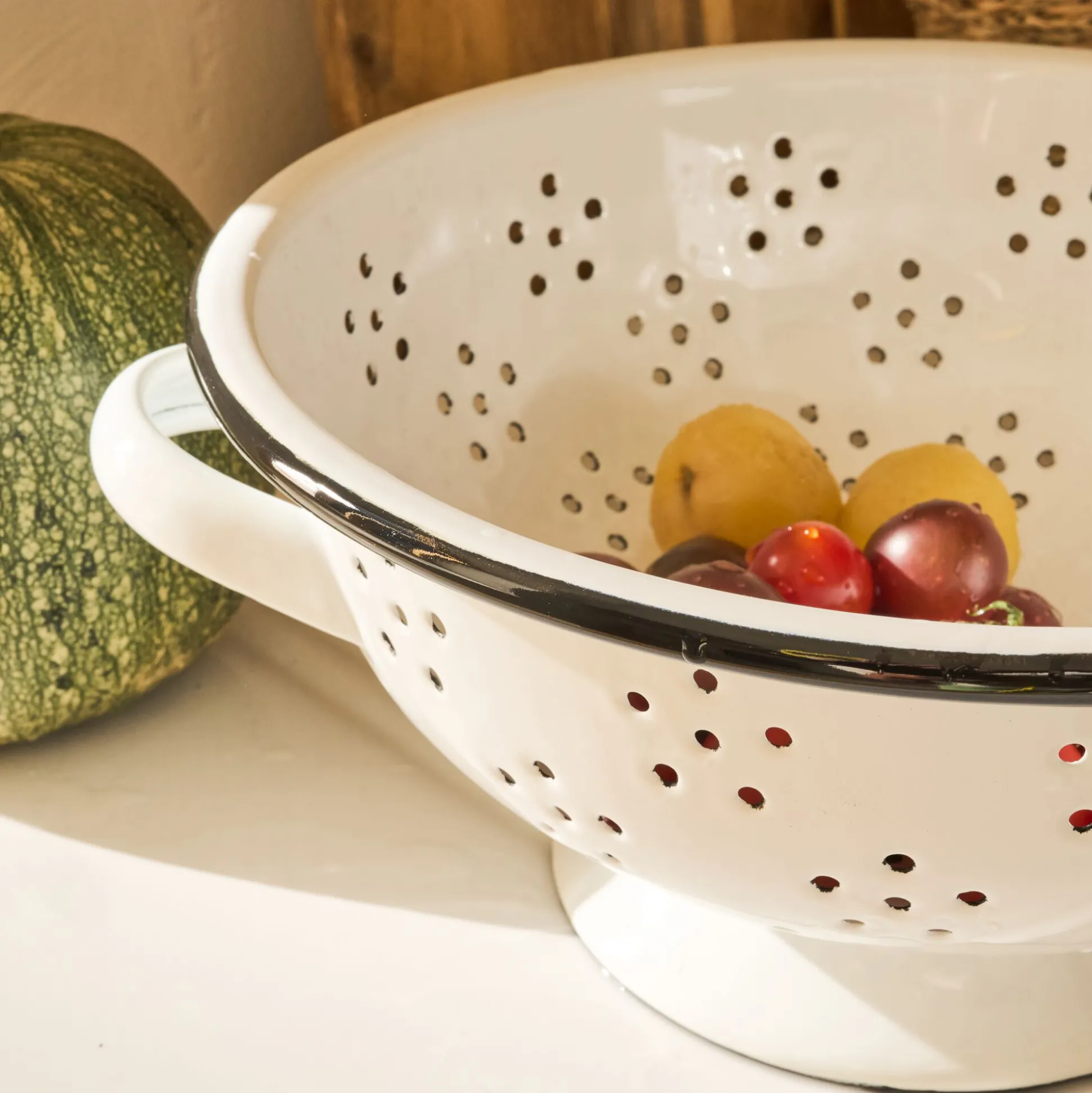 La passoire Cigogne séduit par son style rétro et sa praticité. Réalisée en acier émaillé, elle affiche un diamètre de 22 cm et un coloris blanc rehaussé d’un fin liseré noir. Dotée de deux poignées latérales, elle assure une bonne prise en main au quotidien. Ses perforations, disposées en forme de fleur, permettent un égouttage rapide et efficace des pâtes, légumes ou fruits. Solide et facile d’entretien, cette passoire en métal passe au lave-vaisselle, pour allier charme authentique et fonctionnalité moderne dans la cuisine.