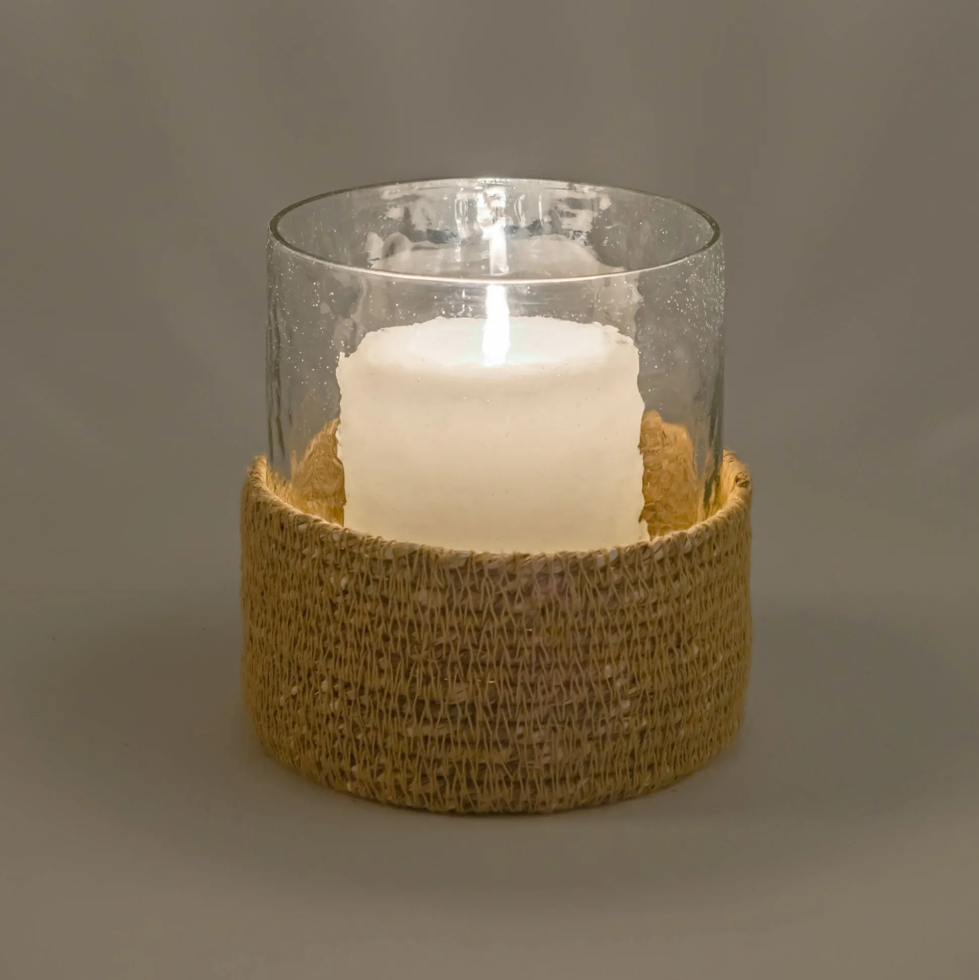 Le photophore Tayma allie transparence et naturel avec élégance. Son cylindre en verre accueille une bougie, tandis que sa base tressée en jonc de mer apporte une touche authentique et chaleureuse. Un objet déco à l’esprit bohème, parfaite pour diffuser une lumière douce et créer une ambiance apaisante.