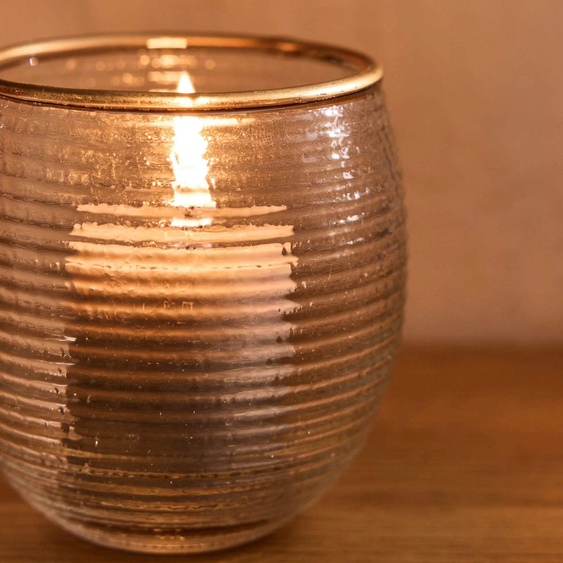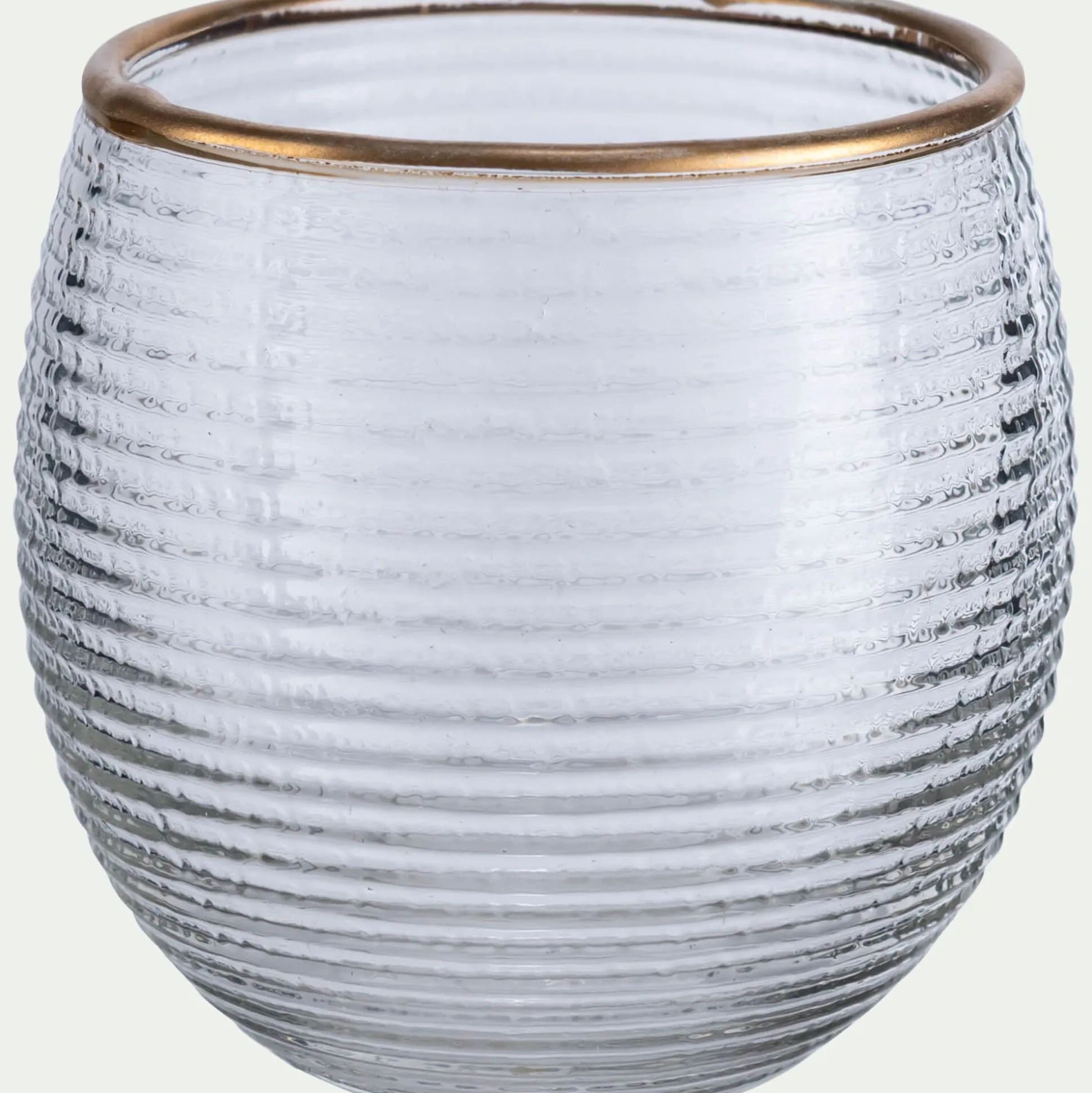 Tout en rondeur, le photophore Solias se distingue par sa matière striée. Le verre transparent est subtilement travaillé pour offrir de la texture, ainsi qu’un effet visuel sur la lueur de la bougie. Ce petit photophore arbore un liseré doré, finition élégante qui convient parfaitement à une décoration festive.