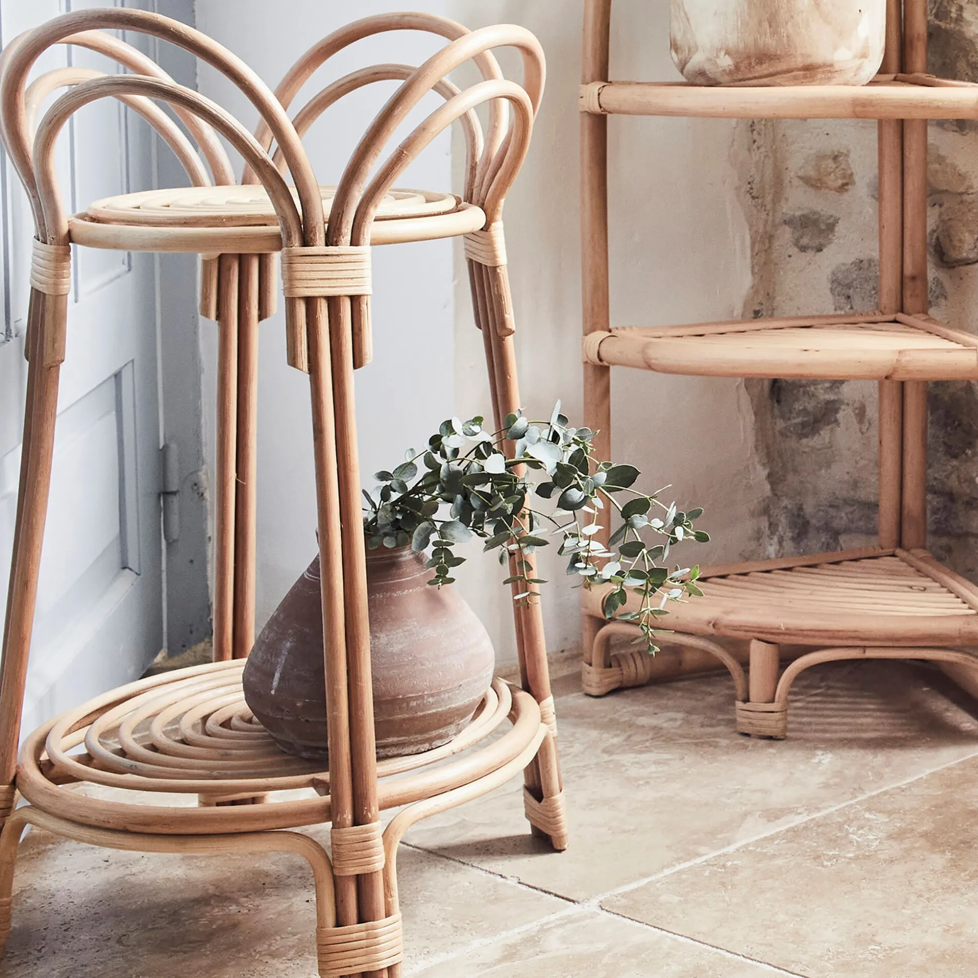 Pour mettre en valeur vos plantes et leur offrir une meilleure exposition tout en sublimant votre décoration, rien de tel qu’un porte-plante. Le porte-plante Lani est fabriqué en rotin et se présente sur deux niveaux superposés. Le rotin est ici travaillé pour offrir un petit meuble d’appoint tout en courbe. Ce porte-plante naturel affiche de belles rondeurs qui inspirent la douceur et la sérénité. Ce porte-plante en rotin mesure 74 cm de haut. Il convient pour un usage intérieur ou extérieur selon vos besoins.