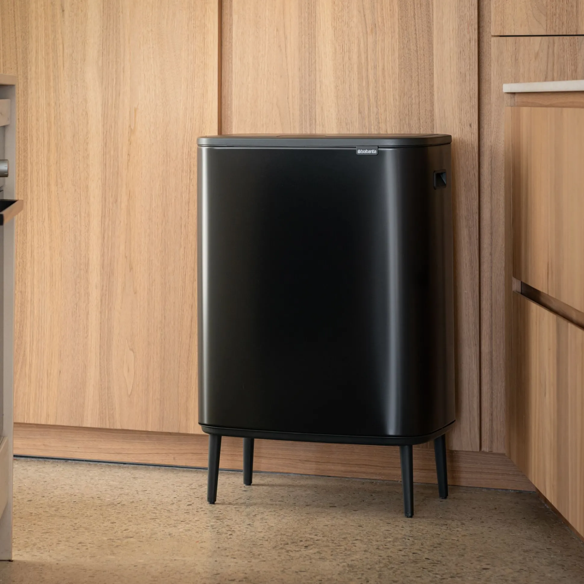Cette poubelle XXL Brabantia Bo Touch 2×30 litres affiche un superbe design et possède tout ce dont vous avez besoin pour trier facilement vos déchets à la maison. Grâce à la présence de deux seaux amovibles d’une capacité de 30 litres chacun, vous avez la possibilité d’y jeter vos déchets selon leur nature. Cette grande poubelle noire en acier est dotée du système Soft Touch : il vous suffit d’effleurer le couvercle pour l’ouvrir. Un objet qui allie ici design et côté pratique afin de rendre votre quotidien plus agréable.