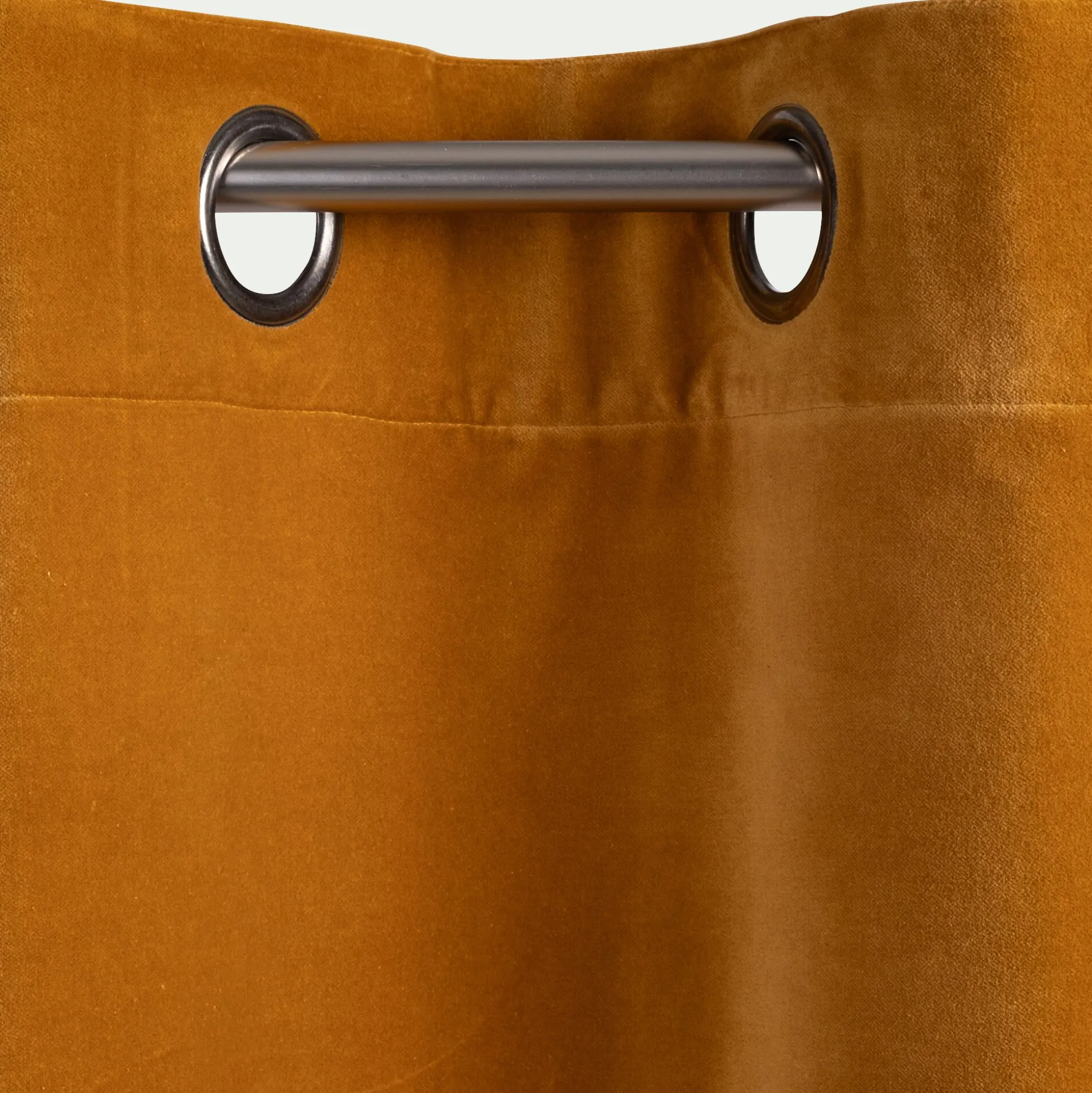 Le rideau Irene, confectionné en coton et lin, séduit par son aspect velours au toucher raffiné. Épais et légèrement brillant, il offre un tombé élégant tout en filtrant la lumière avec douceur. Uni et habillé d’un coloris jaune alep, solaire et précieux, il se présente au format 130×250 cm avec 8 œillets pour une installation facile et un rendu soigné.