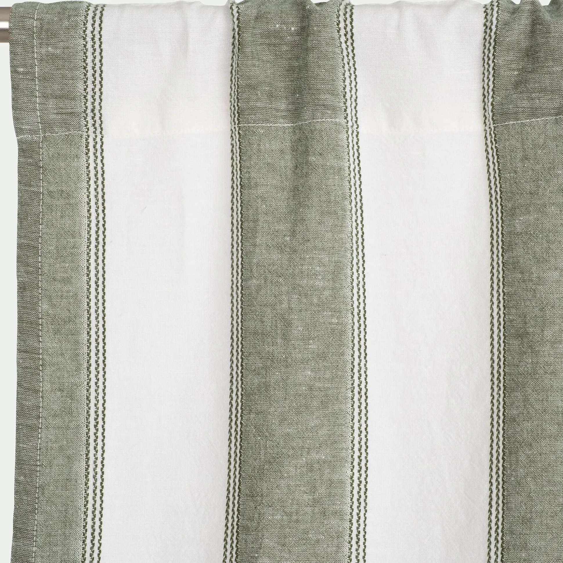 Apportez une touche déco en toute discrétion et délicatesse à votre intérieur avec ces rideaux à rayures vert et blanc. En lin et coton de haute qualité, ils sont confectionnés avec soin au Portugal et témoignent d’un savoir-faire. Ils vous permettront de sublimer votre maison avec charme et authenticité. En 140×250 cm, leur tissu laisse passer la lumière tout en préservant votre intimité pour une ambiance tamisée. Ces rideaux sont le mariage entre élégance et durabilité. Leur matière naturelle et leur doux coloris créent une atmosphère lumineuse et apaisante dans votre pièce. Idéaux pour habiller vos fenêtres avec subtilité, ils s’adapteront à une déco naturelle ou moderne.
