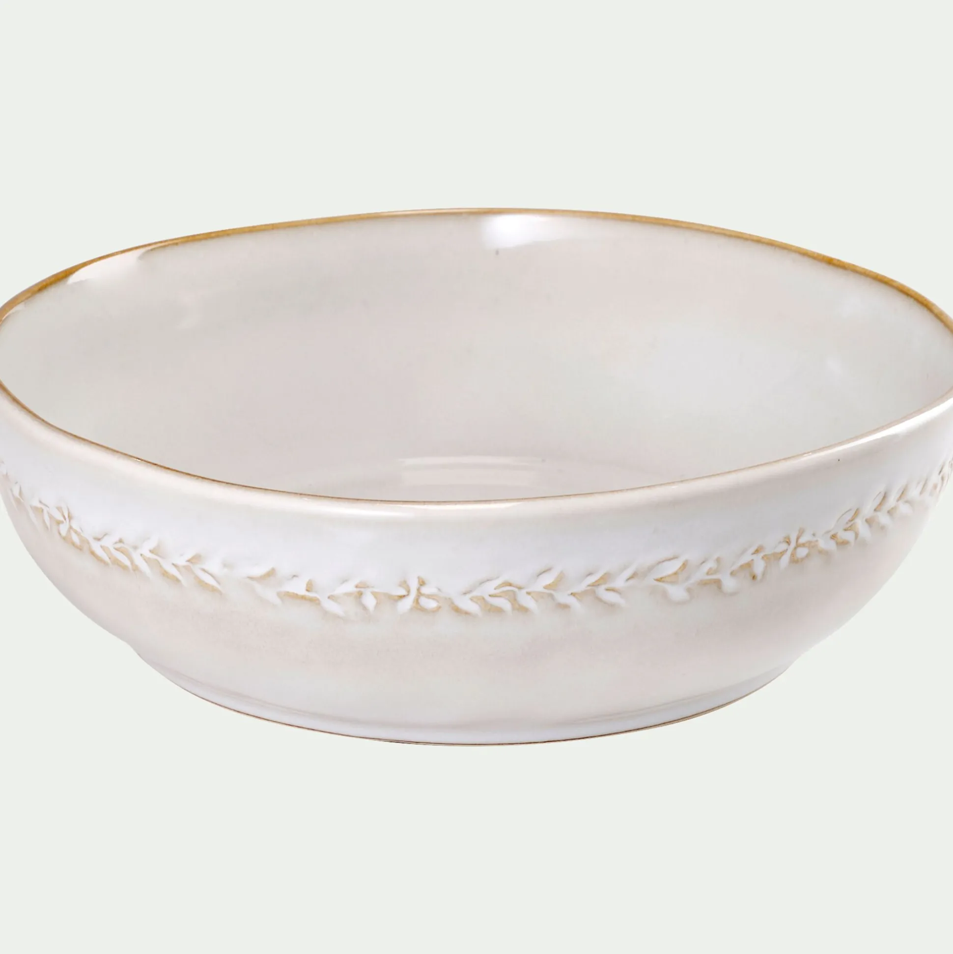 Servez vos salades de saison dans ce grand saladier de 26cm de diamètre. Confectionné en grès, c’est une belle pièce de vaisselle au caractère authentique. Dans notre coloris beige alpilles, une nuance douce et lumineuse, ce saladier en grès arbore un motif en relief. Une frise végétale est imprimée sur les bords de ce récipient, offrant du cachet à l’ensemble. Polyvalent, ce saladier beige peut également contenir des fruits.