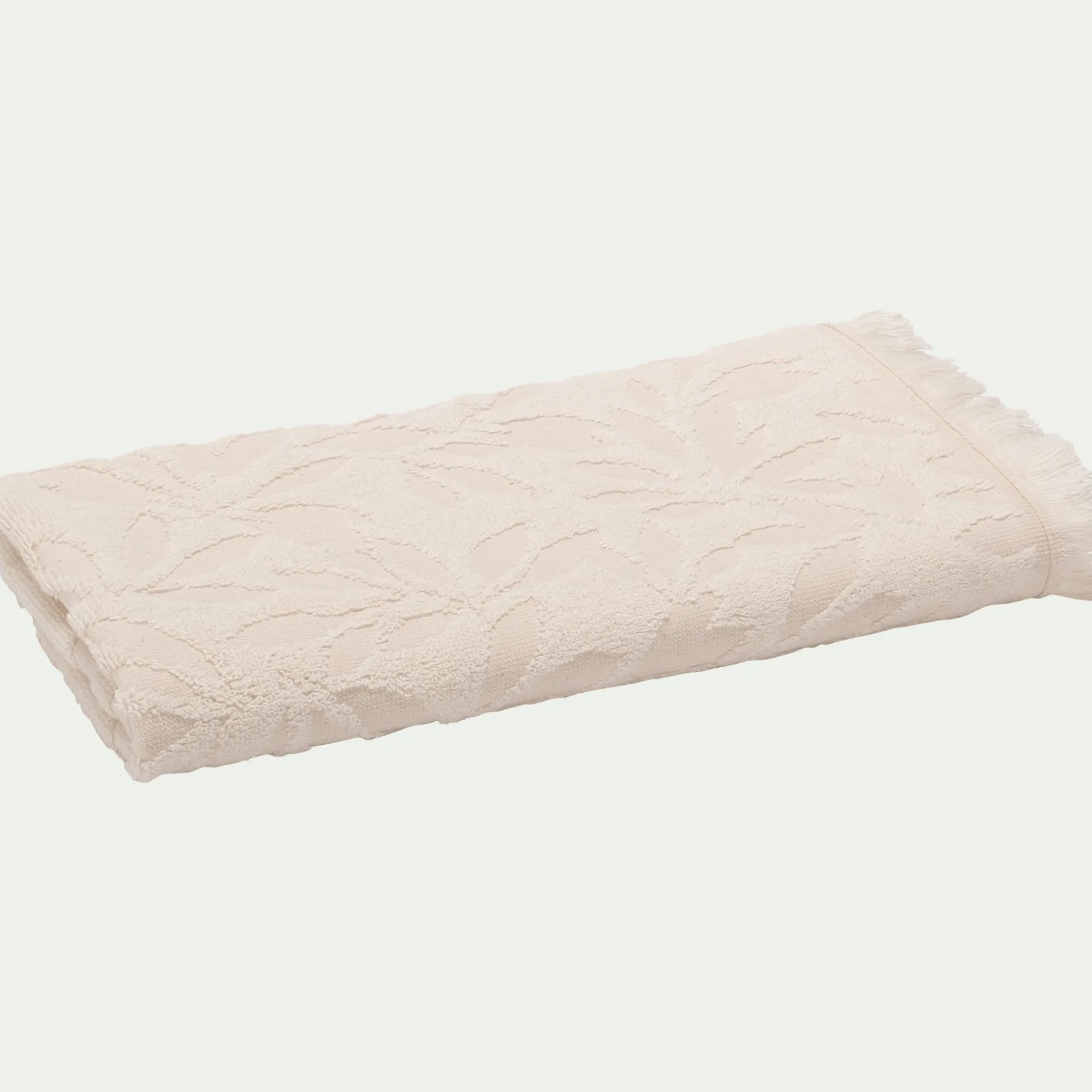 Alloro est une serviette de toilette dans une couleur naturelle séduit par son élégance discrète. Sa teinte claire, intemporelle, sublime le motif floral en jacquard. Douce et absorbante grâce à son coton 500 g/m², elle est aussi raffinée avec sa finition frangée. Fabriquée au Portugal et certifiée Oeko-Tex, cette serviette de 50×100 cm trouve parfaitement sa place dans la salle de bain.