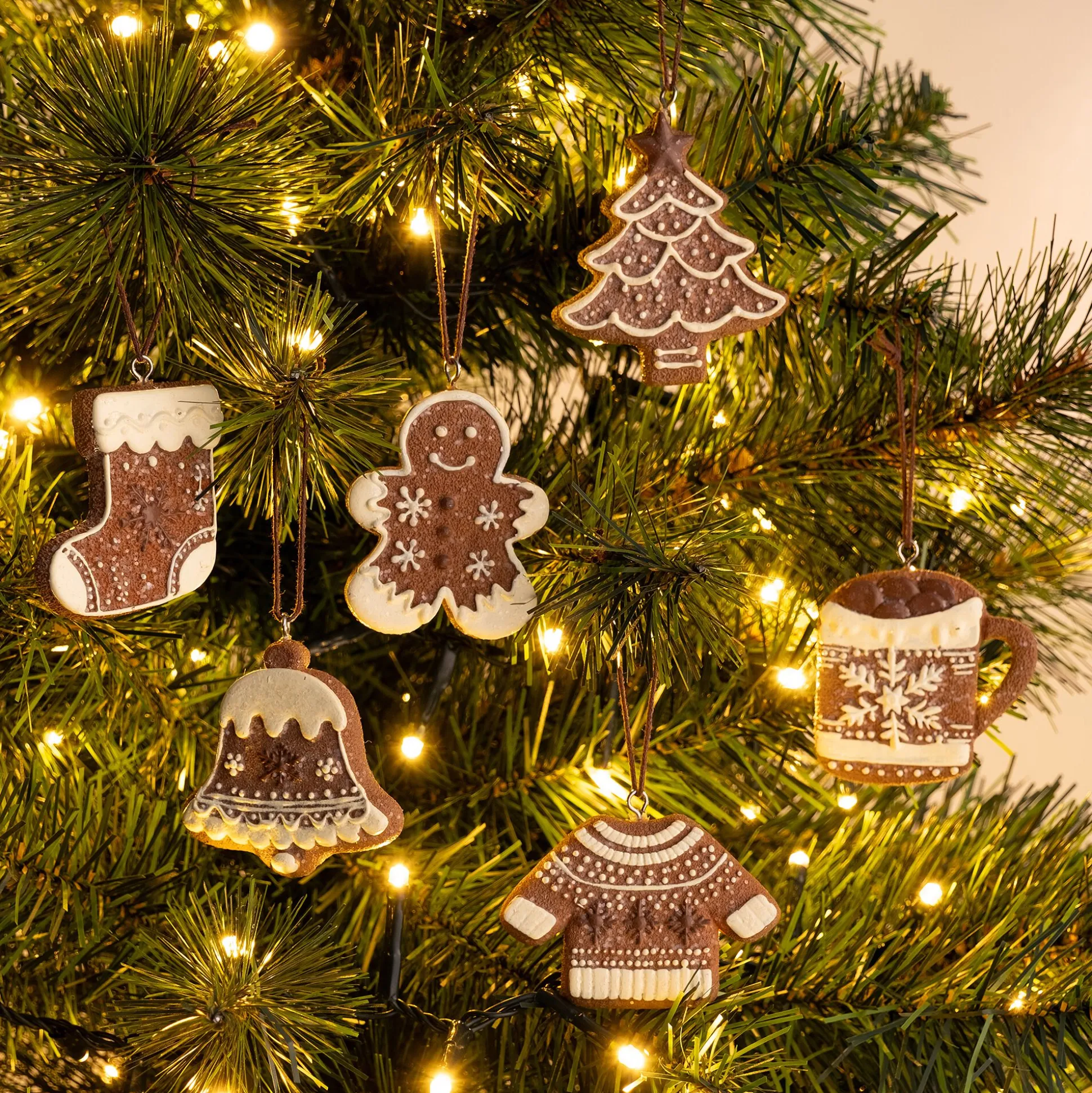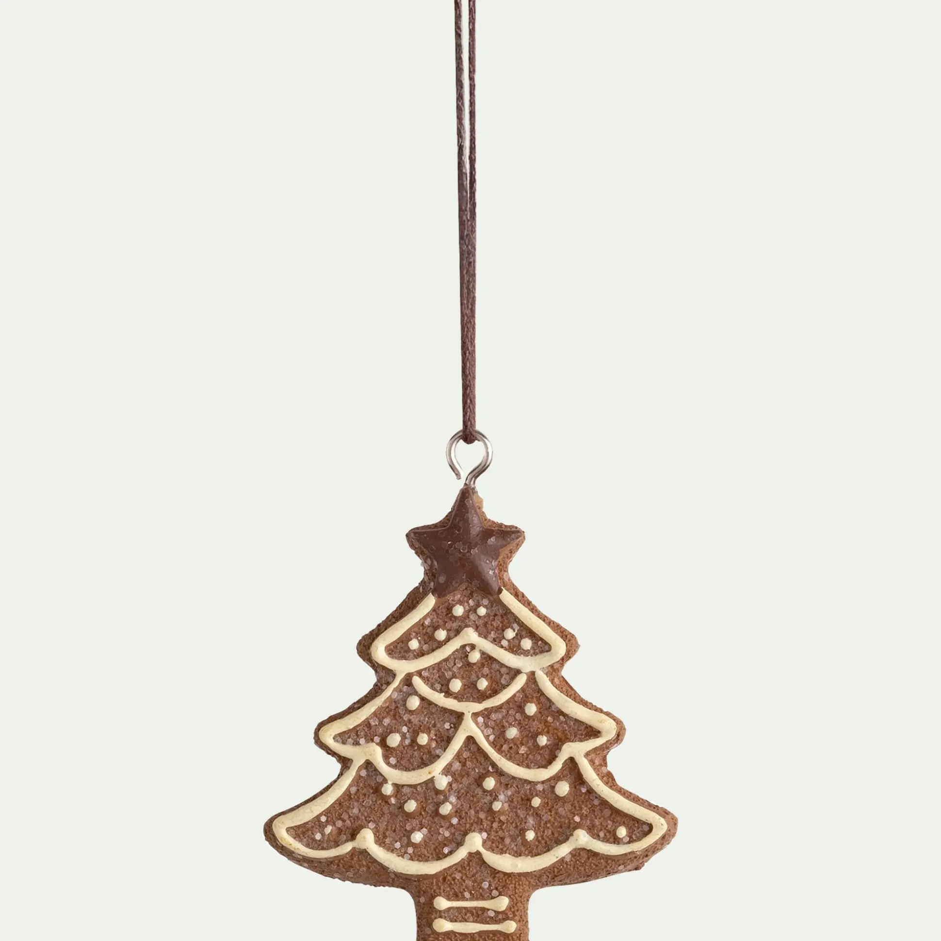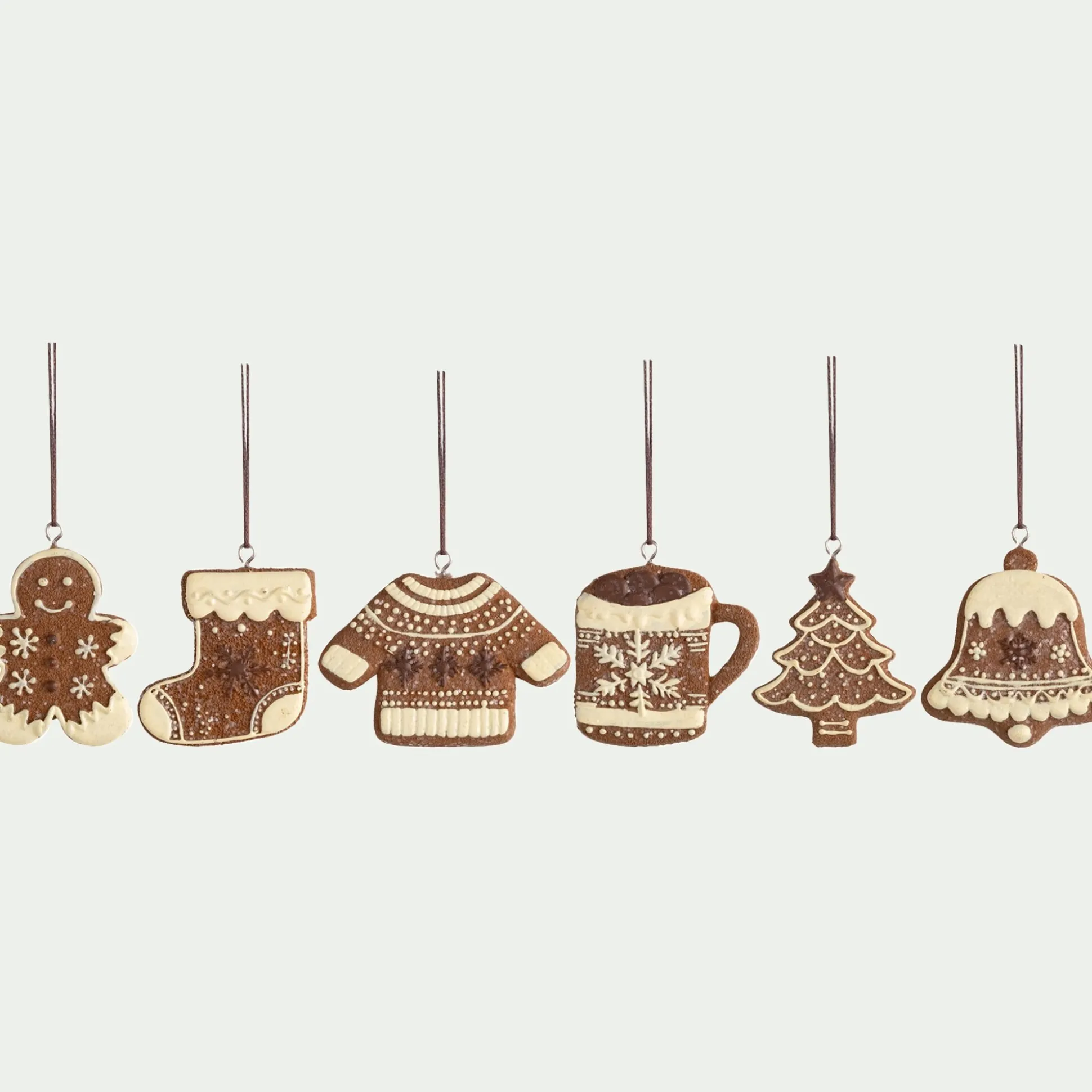Les suspensions Ambazac évoquent la douceur des fêtes avec ses formes de biscuits en pain d’épice. Chaque pièce, en marron glacé rehaussé d’un glaçage blanc, imite des gourmandises de Noël : petit pull, chaussette, cloche… Une décoration du sapin aussi originale que chaleureuse, qui apporte une touche ludique et sucrée à la déco.