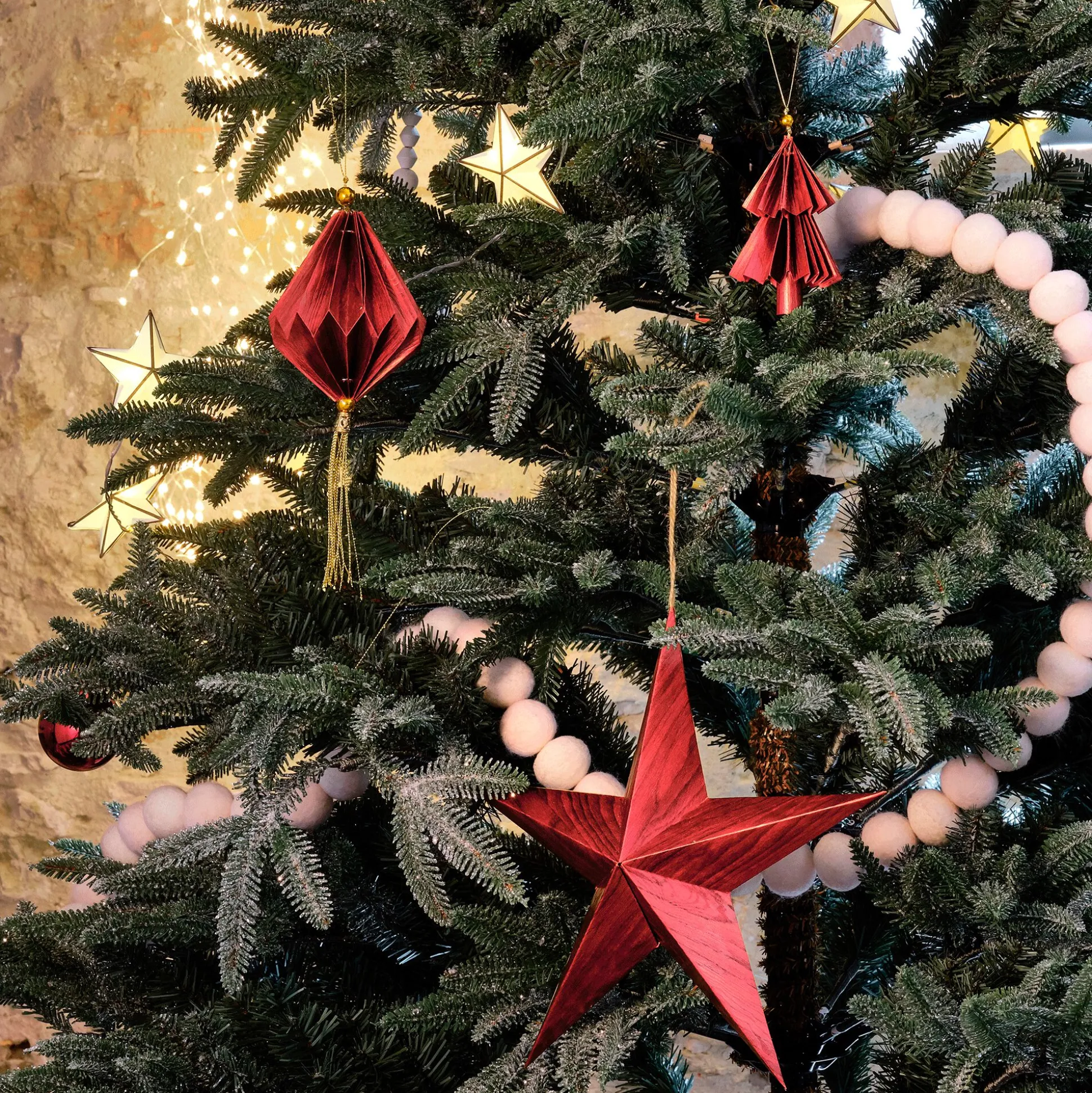 Cette suspension étoile rompt avec les codes traditionnels de Noël. En papier, elle fait écho aux origamis asiatiques et appelle à un Noël naturel et exotique. Son papier rouge révèle un effet de bois marbré tendance. Sa fine corde permet d’accrocher cette suspension atypique dans votre sapin de Noël mais aussi à divers endroits de la maison. Une décoration de Noël qui se décline dans différentes formes.